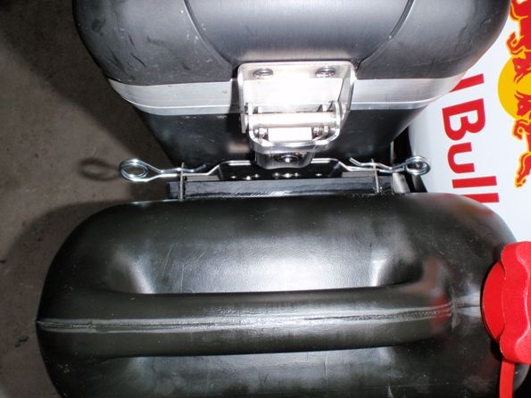 Die Laschen meiner Edelstahlplatten an den Tanks passen nun in die TT Halterungsplatten mit Winkel, in die Langlöcher durch die normalerweise die Spanngurte gezogen werden werden die Kanister einfach eingesteckt, zurückgeklappt, dann flutschen die oberen Laschen durch die senkrechten Löcher der Montageplatte und mit 2 Federsteckern gesichert.