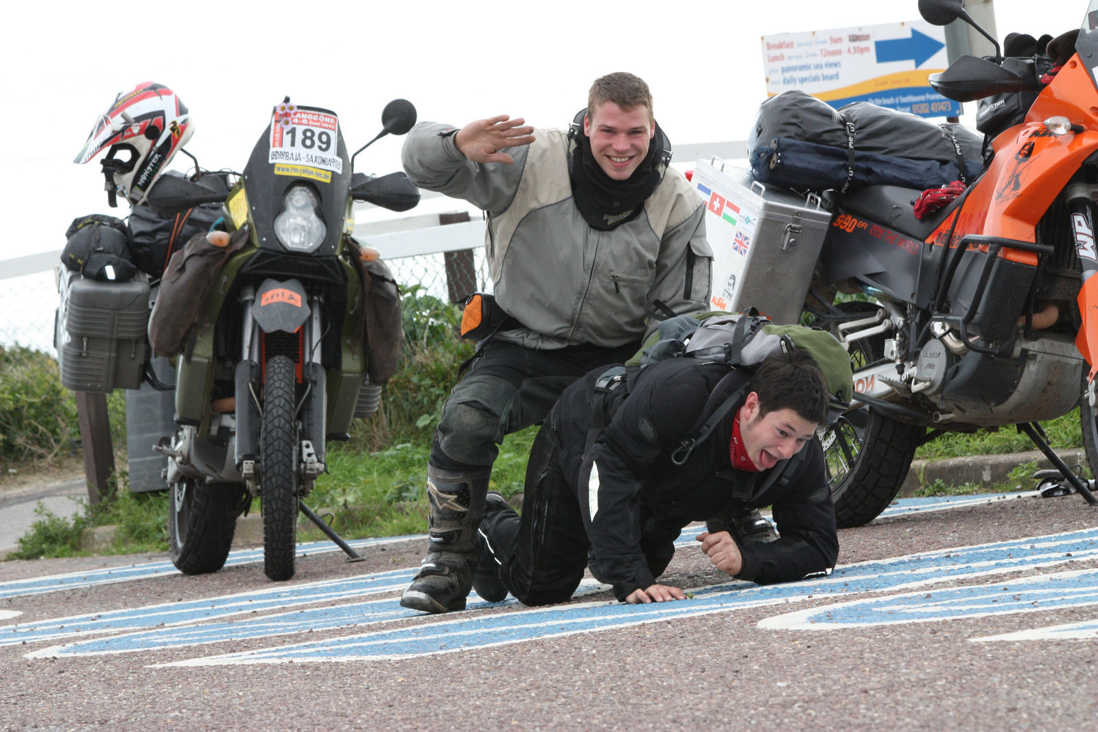 Kurz vor Ostende, der Ort an dem unsere Fähre fährt, wir sind auf der Outobahn (oder einen fetten Bundesstraße). Eine rote Ampel – wir stellen uns auf ein Beschleunigungsrennen ein. Ich stehe vorne, Ampel springt auf grün, ich ziehe los – die anderen nicht – verdutzt werfe ich einen kurzen Blick nach hinten. Im Blickwinkel sehe ich ein Blau Weißes Motorrad mit Rundumleuchte. Heinz startet los, einige Meter auf dem Hinterrad. Au Mann, er hat den Beamten nicht gesehen. Atzimuth und ich fahren langsam hinterher, unsere Blicke sagen das gleiche „er wird gef**kt“.