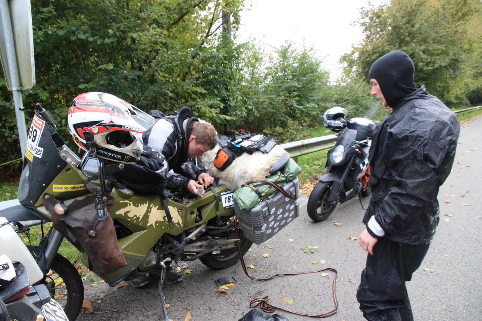Irgendwo in Luxemburg auffer Dosenbahn haben wir nen Halt gemacht (zwecks Regenkombi). Danach ist Atzis Kiste nicht mehr angesprungen. Klasssse!