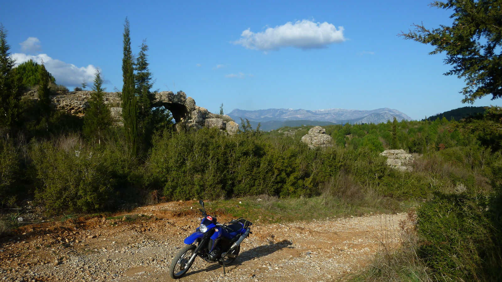 Erste Runde in Tourenbekleidung, Side zu den Manavgat-Stromschnellen, nix besonderes, dann das antike Lybre, paar schöne Aquedukte und dann die Anlage auf 300 m Höhe. Sides Umgebung ist außerhalb nicht sehr einladend, lediglich die umfangreichen Ruinen in Strandnähe wirken sympathisch. Im allgemeinen liegt ziemlich viel Müll in der Landschaft rum. Je weiter man in Berge kommt, desto schöner wird’s. Alles in allem angenehme 75 km gefahren. In den Bergen sind die Wege schon ganz schön grob, Morgen werden Enduroklamotten angezogen.