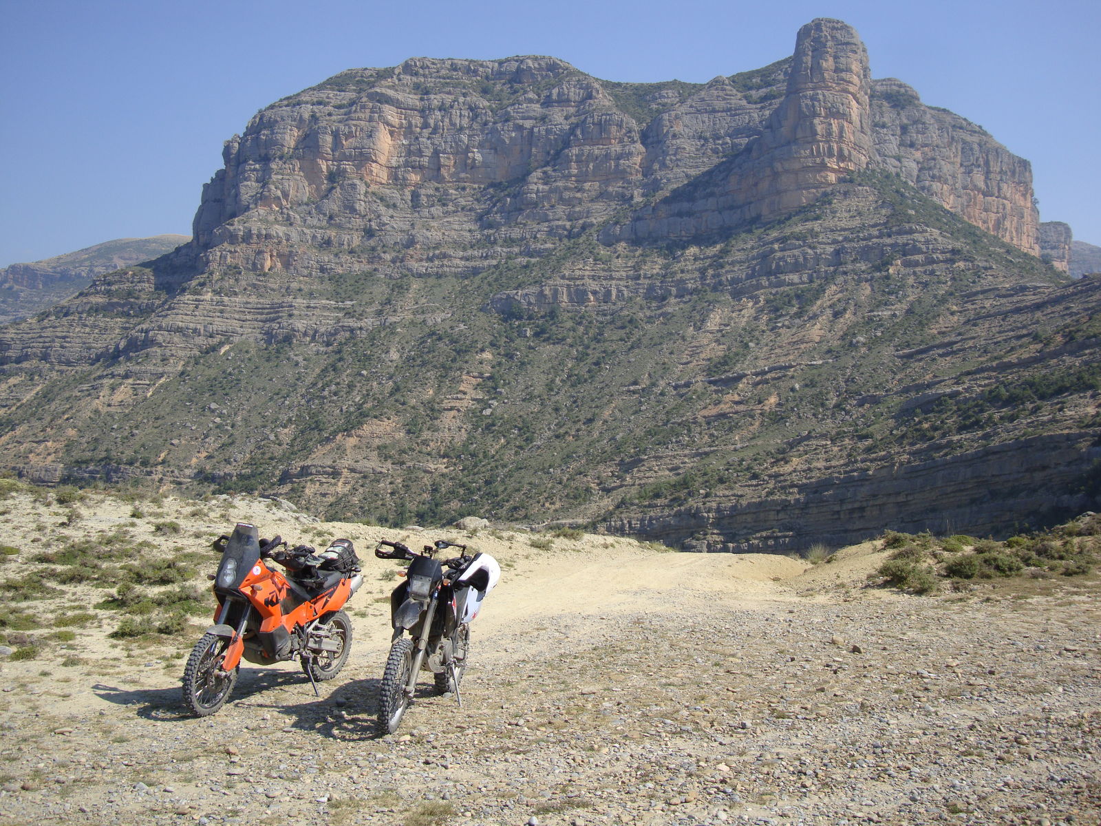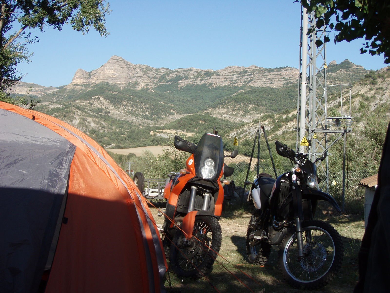 Zu zweit mit einer 950er Adventure S und als Fährtenlegegefährt die kleine schwarze Lc4 sind wir, nach kurzem Strandbesuch in Hossegor, direkt nach Puebla de Roda gefahren und haben dort in einem Aussenposten der Campinggroßmacht Holland gecampt. Der Campingplatz war okay bis gut (camping Isabena) ...wenn nicht ein Heer von Gnitzen (oder auch Kriebelmücken) unsere Haut in Fetzen gelegt hätte.