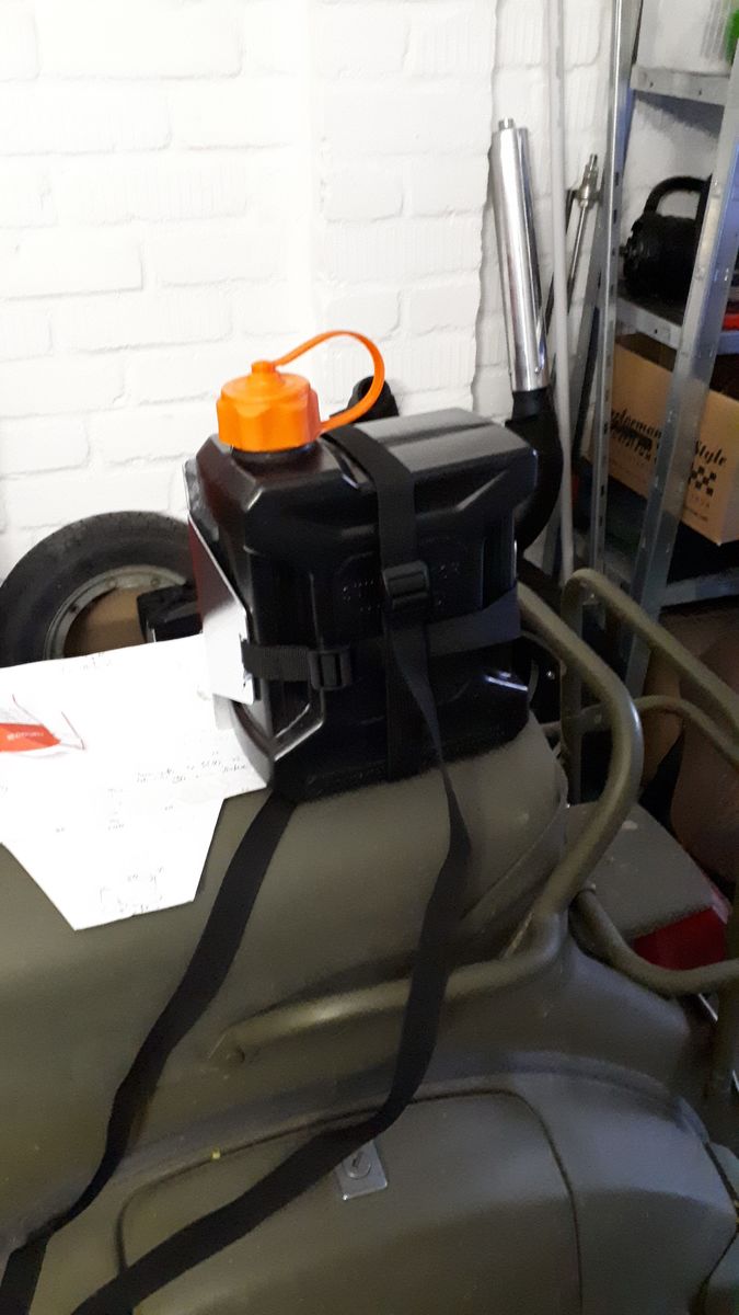 Ich hol' den Thread mal hol. Hab' mir nämlich was gebastelt Die 2,5 Liter Givi Kanister gibt's für 14-15 EUR bei Polo. Die Halterung kostet irgendwie doppelt so viel plus. Also habe ich mir selbst was gebaut. Sehr simpel. Die sich kreuzenden Packriemen kürze ich noch passend. Befestigung dann hinten auf den Koffern.