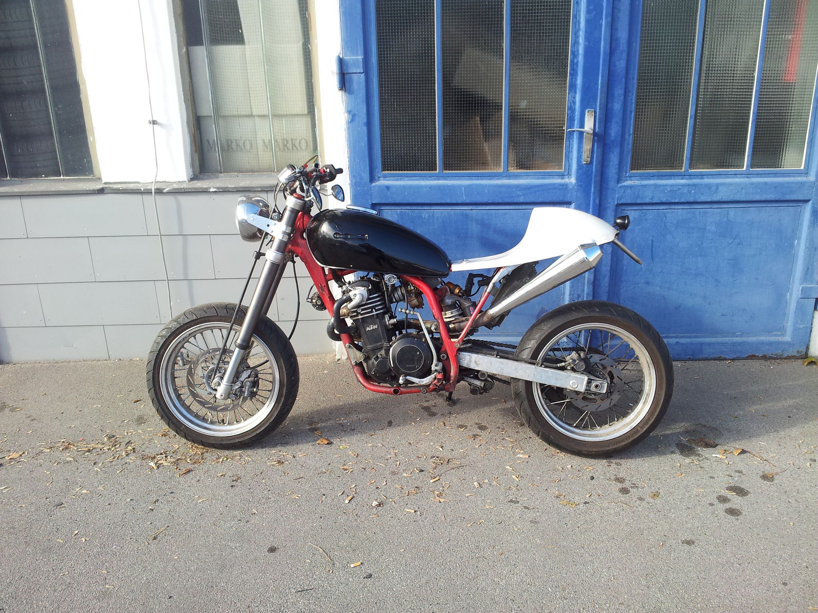 Ursprünglich handelte es sich bei der Maschine um eine äußerst grindige 91er LC4, die sichtlich nicht gerade in den Brunnen der ewigen Schönheit gefallen ist. (siehe Foto) Da sie aufgrund ihrer graziösen Optik und der brachialen Leistungsentfaltung des gefühlten 20 PS Triebwerks (ohne Ausgleichswelle wohlgemerkt) vermutlich nicht einmal die Ungarn bei der "Sperrmüllabholung" mitnehmen würden... habe ich kurzer Hand beschlossen, i bastl afoch wos Lustiges draus! Nachdem ich das Moped gestrippt und alle KTM Plastics blitzartig entsorgt hatte, montierte ich vorerst provisorisch anstelle des originalen Kunststofftanks den Blechtank einer alten Yamaha XS400 und anstatt der KTM Lichtmaske einen verchromten Scheinwerfer (ebenfalls einer XS400). ...sah schon ganz witzig aus, aber noch lange nicht wie ein "altes klassisches Motorradl. Um optisch einen "luftgekühlten Look" zu erzielen, habe ich den rechten Wasserkühler (ab Werk vorne am Rahmenbrustrohr verbaut) im Heckrahmen unter dem Sitz verbaut. Natürlich werden jetzt gleich alle aufschreien: "Ein Wasserkühler im Heck bringt weniger Kühlleistung als zwei Kühler an der Front" Richtig, die Kühlleistung eines Wasserkühlers im Heckrahmen ist natürlich nicht so effektiv wie die zweier Kühler an der Front, jedoch kann ich bestätigen, dass der Wasserkühler im Heck aufgrund der langen Kühlwasserleitungen unter "normalen Bedingungen" völlig ausreicht und sich ausschließlich im Stadtverkehr bei längeren Stehzeiten ohne Fahrtwind hie und da mal a bissl anspeibt!