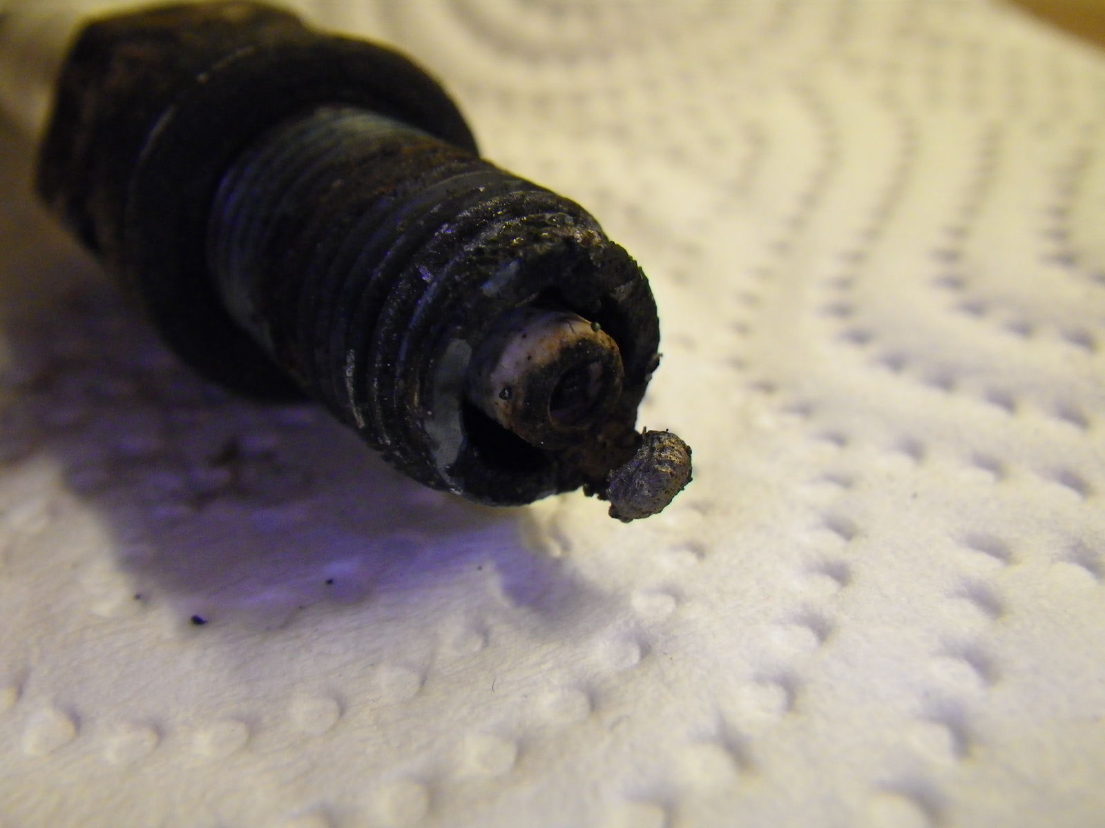 Da fehlen Teile von Mittel- und Masseelektrode, die nicht einfach so wegbrennen oder abfaulen. Ich wünsche viel Vergnügen, wenn der Zylinderkopf mal runter muss. Die Metallstückchen verewigen sich in Kopf, Kolben und Ventilen.