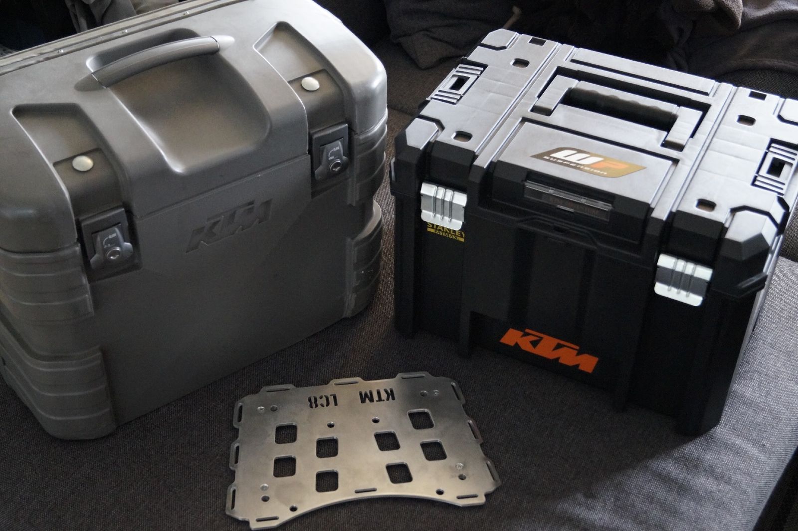 Fertige Gepäckbrücke, Topcase und Gobi-Koffer zum Größenvergleich.
