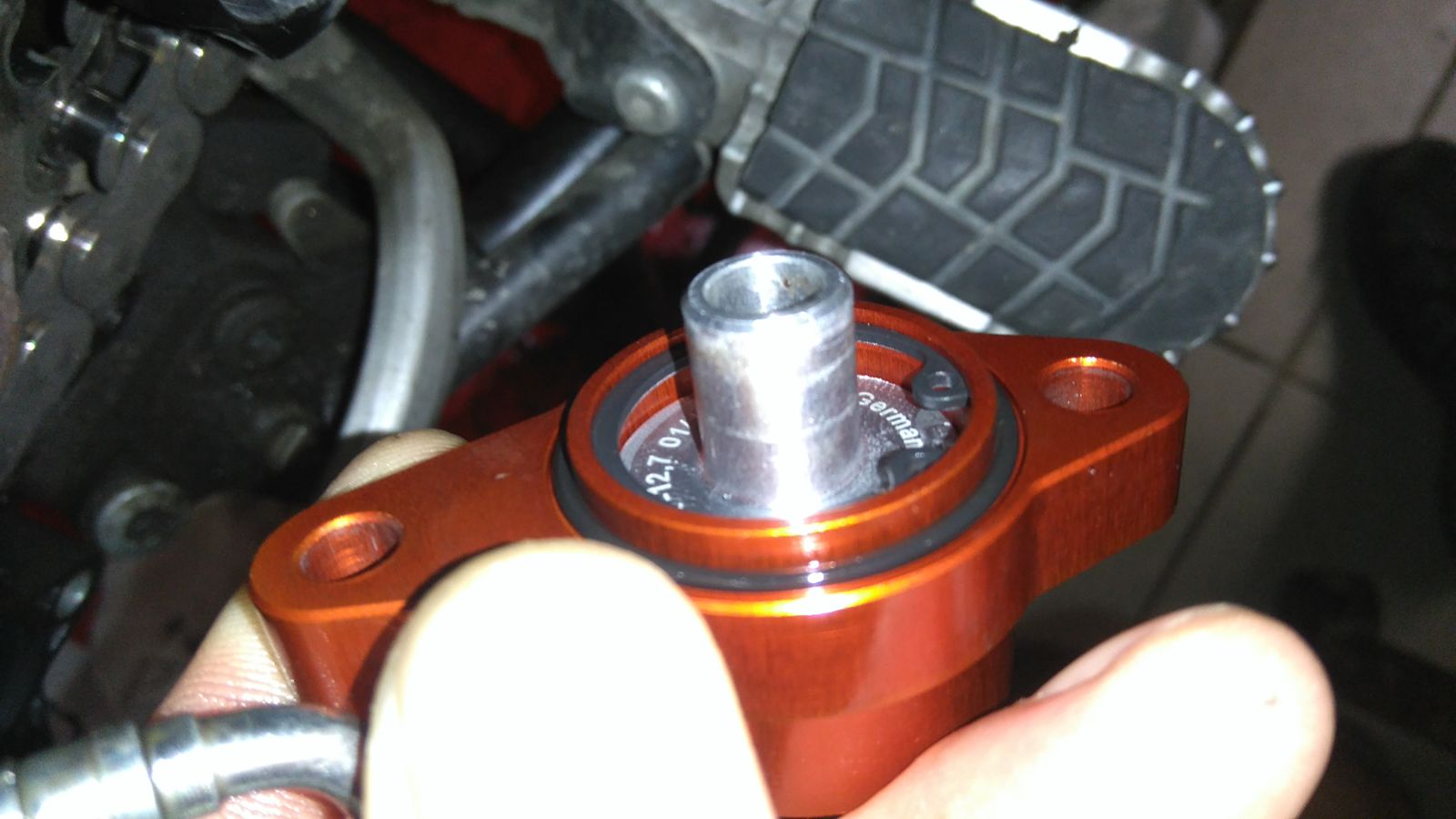 Ich hab gestern mal den Kolben von Hand eingedrückt. Siehe Bild. Um ihn wieder bis an den Sicherungsring zu drücken musste ich 2 mal am Hebel pumpen.ist das normal? Entlüftet hab ich auch noch mal. Morgen versuch ich mal den Griff abzuschrauben und dann zu entlüften.