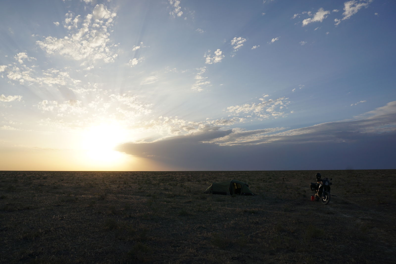Anschließend ging es durch ein schier endloses Niemandsland zum Grenzfluss über den diesmal eine richtige Brücke führte. Am Fuß der Brücke steht noch ein einsamer russischer Soldat der den obligatorischen Stempelzettel einsammelt und euch dann freundlich entlässt. Die nächste und damit erste kasachische Station ist dann eine winzige Holzhütte direkt oben auf der Brücke! Dort sprang ein sehr junger kasachischer Grenzer aus dem Häuschen und winkte mich zu sich. Absteigen, Helm ab, Pass zeigen...Das übliche Spiel! Auf die nächste Reaktion war ich allerdings nicht vorbereitet...Nachdem seine dienstlich vorgeschriebene Neugier befriedigt war, gabs zum Abschied ein fröhliches "Welcome in Kazakhstan", ein Highfive(!) und den freundlichen Hinweis zur nächsten Hütte weiterzufahren^^ Was war denn hier los? An der nächsten Hütte das gleiche Spiel. Hier war offensichtlich die obligatorische Migrationskarte auszufüllen. Der ebenso junge Grenzer lies sich nach der Begrüßung einfach den Pass geben, füllte das Ding ungefragt einfach selbst aus und schickte mich lachend weiter die Straße runter wo dann die eigentliche Kontrolle stattfinden sollte. Dort angekommen nahm man mich wiederum sehr freundlich in Empfang und zeigte mir die Passkontrolle (die sogar in Englisch stattfand). Dort bekam ich tatsächlich ungefragt sämtlich Stempel in die Migrationskarte und musste mich deswegen nicht mehr bei einer der "Touristenagenturen" in Kasachstan melden...Perfekt! Weiter zum Gepäckcheck. Dieser Grenzer machte lediglich das international anerkannte Zeichen für Pistole, gab dazu "pewpew" Geräusche von sich und sah mich fragend an. Als ich das aber mit einem freundlichen njet verneinte, war auch diese Station erledigt. Alles in allem hatte die Grenzprozedur auf kasachischer Seite ca. 10 Minuten gedauert. Was für eine Überraschung! Direkt nach der Grenze hielt mich noch ein kasaschischer Polizist an, lies sich meinen Führerschein zeigen und warnte mich vor der vor mir liegenden Straße. Das wars^^ "Welcome to Kazakhstan"!