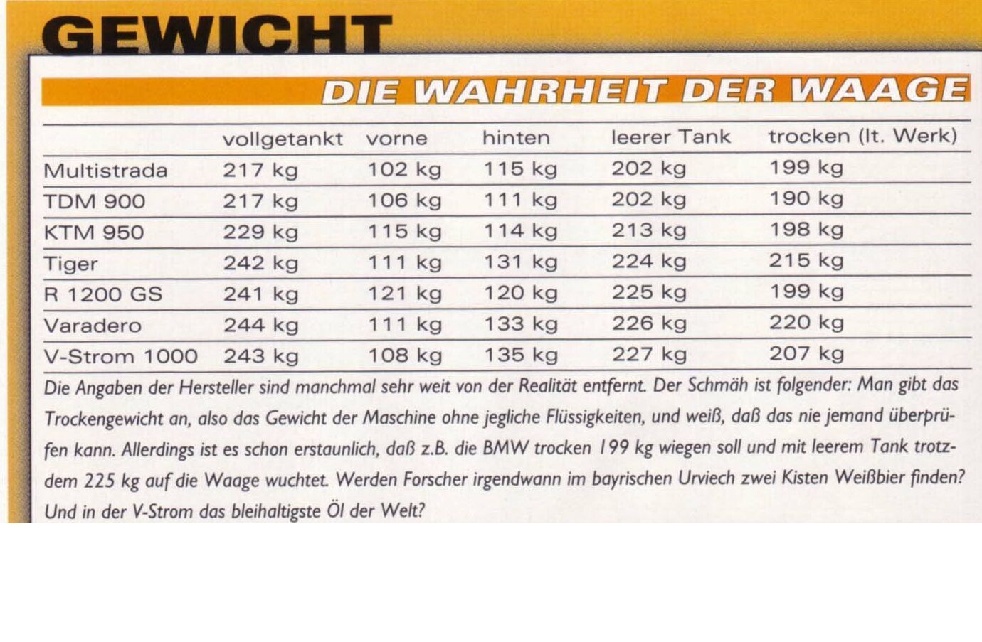 Ah, die Gewichtsfrage. Mit der beschäftige ich mich auch schon seit geraumer Zeit. Aber das Internet (inklusive KTM-Site) und die Zeitschriften geben ja nicht allzuviel her.