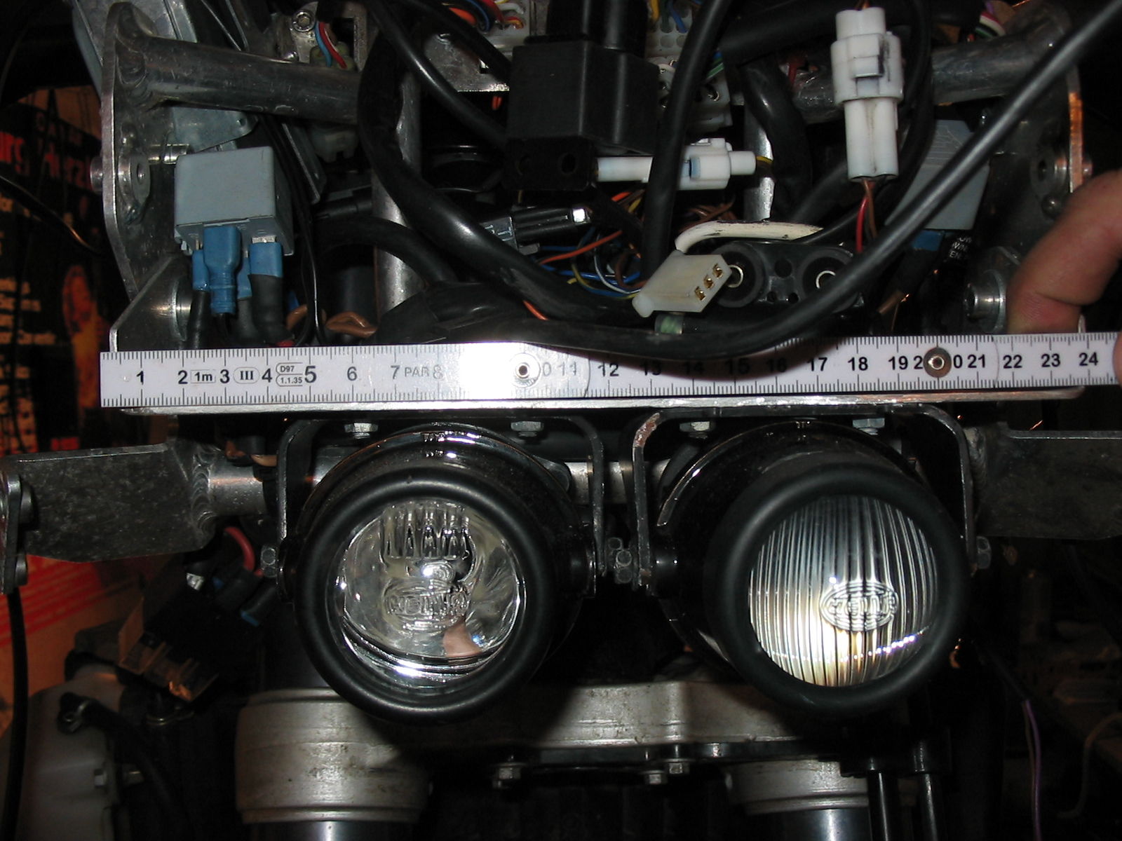 Ich würde sie natürlich wieder schön eng nebeneinander bauen (Halter versetzt vordere und hintere Befestigungbohrungen benutzen), so kann man die Orginale "Lampenunterverkleidung" beibehalten.
