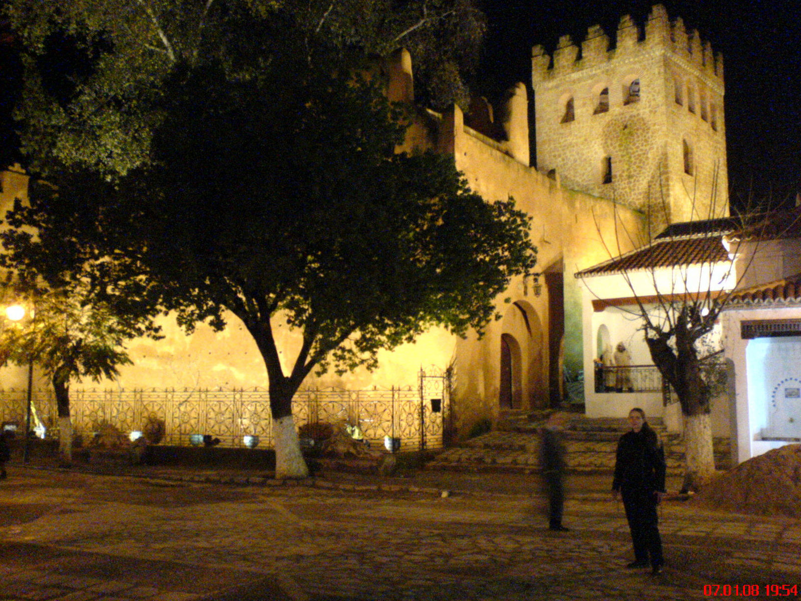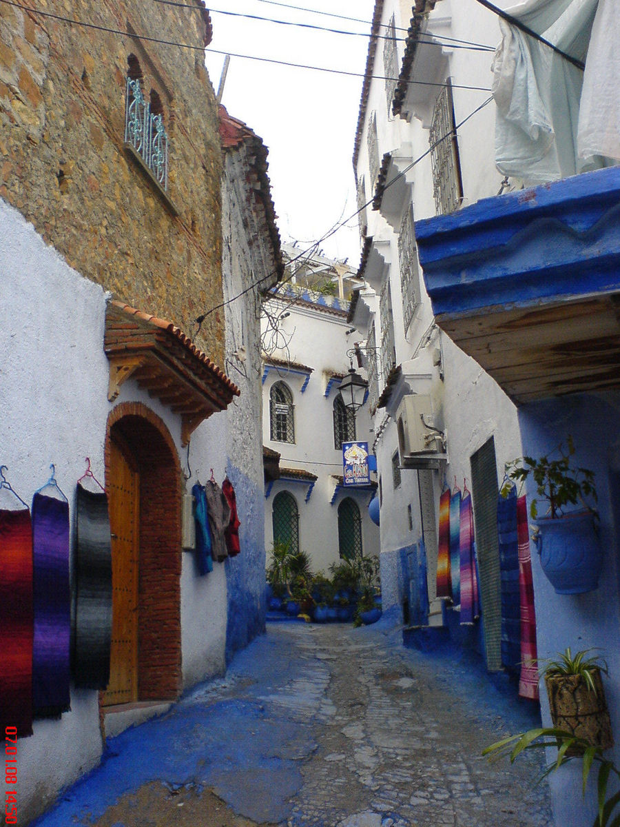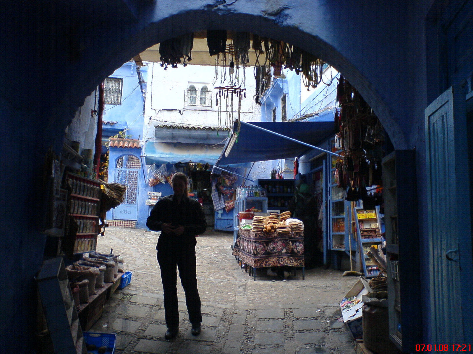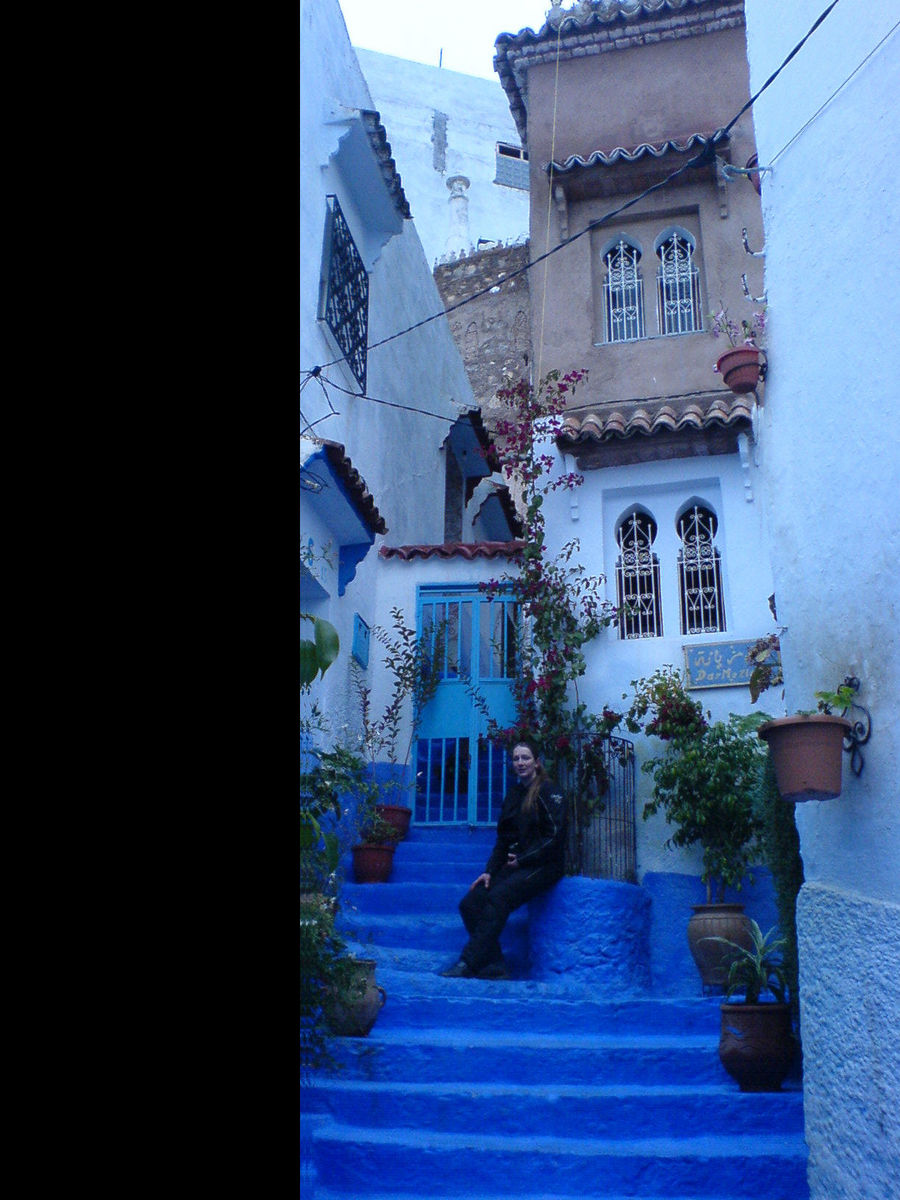 Der Ort wieder katastrophal, plötzlich stehst du mitten im Schlamm, dann der Wochenmarkt direkt auf der Strasse viele Leute, Obst, Gemüse, Altes und Gebrauchtes. Häuser, die beim dritten mal hingucken im letzten Jahrhundert vielleicht mal schön gewesen sein könnten. An einer Kreuzung wird ein uralter Bus repariert, da liegen Leute drunter und schweissen ! bloß nicht über die Beine Fahren. Weltkulturerbe ??? Da ein Schild "Medina" --> hin, die Brumme an einen Lichtmast gefesselt. Nun eine Welt wie im Märchen. Ganz kleine verwinkelte Gassen, alles in verschiedenen blautönen bemalt, unbeschreiblich schön. Kleine Lächdchen, Handwerk, orientalische Gerüche, Stände leckere Naschereien, Gewürze, eine Kasbah. Hier durften früher Nichtmuslime gar nicht rein, jetzt ein kleinwenig an Tourismus angepasst.