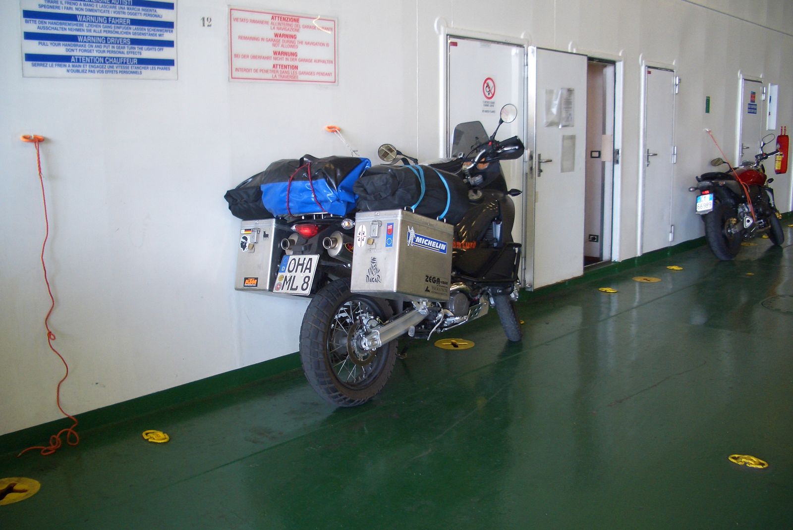 wenn du die kati auf dem seitenstaender verzurrst solltest du beim loesen der gurte aufpassen. ich hab die linken spanngurte zuerst geloest und gar nicht gemerkt, dass der bock sich durch die grossen federwege und die vorspannung auf die rechte seite legt