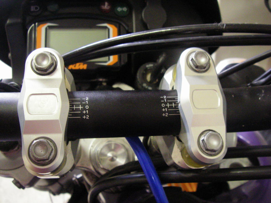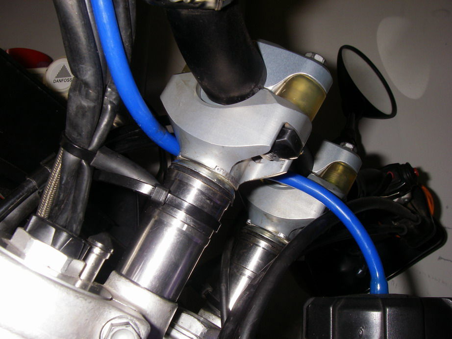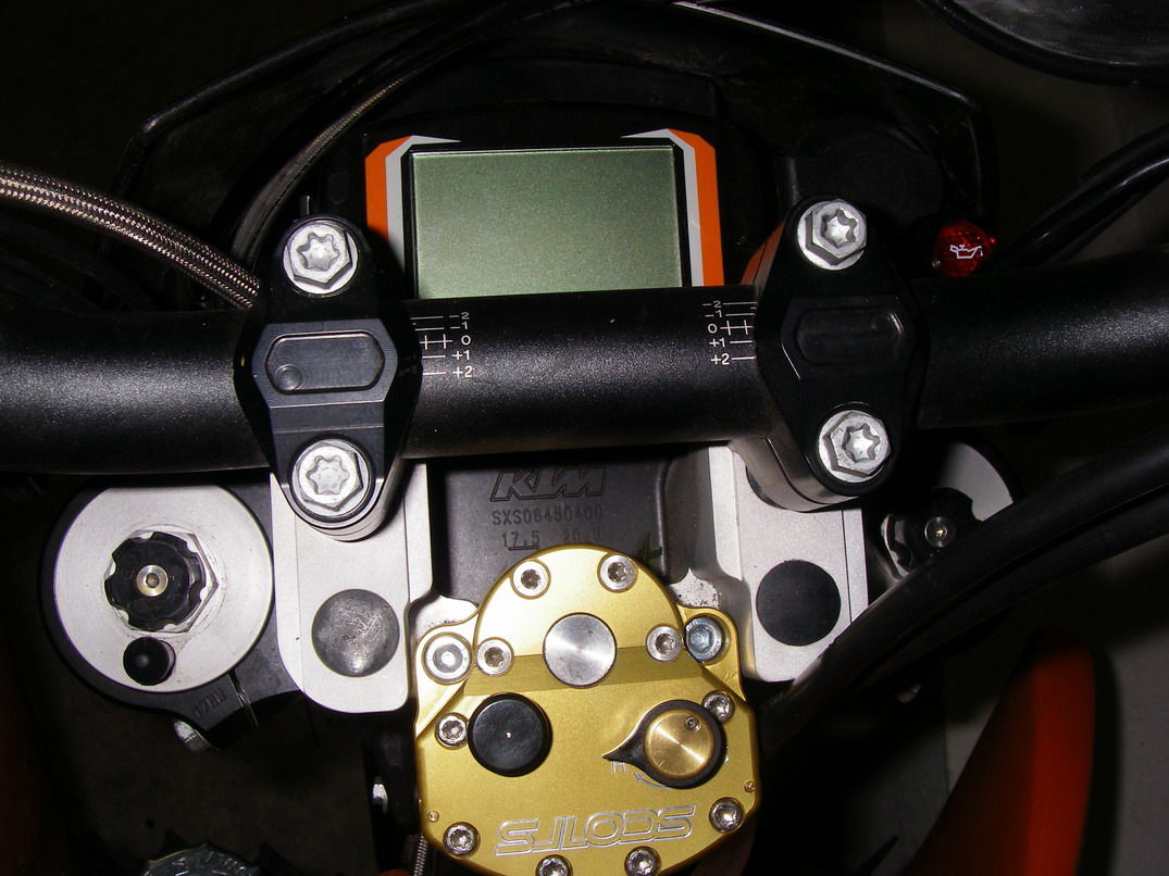 ist schwer zu messen. Das Einzige, was geht ist, die Lenkerenden in vertikaler Richtung zu belasten. Da ist dann bei einem 805mm langen Lenker ungefähr 15mm (also+/-7,5mm) Weg zu verzeichnen. Die Dämpfung soll aber laut Hersteller in alle 6 Richtungen arbeiten. Die verbauten gelben Gummis sind die mittlere Stärke. Gibt es noch in ROT=hart und GRÜN=weich. Eine EXC400 mit den grünen Gummis fährt sich wie ein Elektrobike Smile . Mit den gelben Gummis ist kein Eigenleben des Lenkers zu merken. Nur die Vibs sind auf ein sattes Drittel geschrumpft Very Happy . Das Teil gibts wie abgebildet von KTM und in schwarz direkt beim Hersteller: http://www.xtrig.de/index.php?lang=DE&uid=452378767a4f80a2978208ee14c31f73&page=shop&id=&ucat=&pid=19. Dazu gibts dort noch ein paar Lenkererhöhungen und eine nicht gedämpfte Lenkeraufnahme(Foto). Achtung: das Schwarze Teil passt nicht auf die gefräßten Gabelbrücken von KTM/Husaberg.