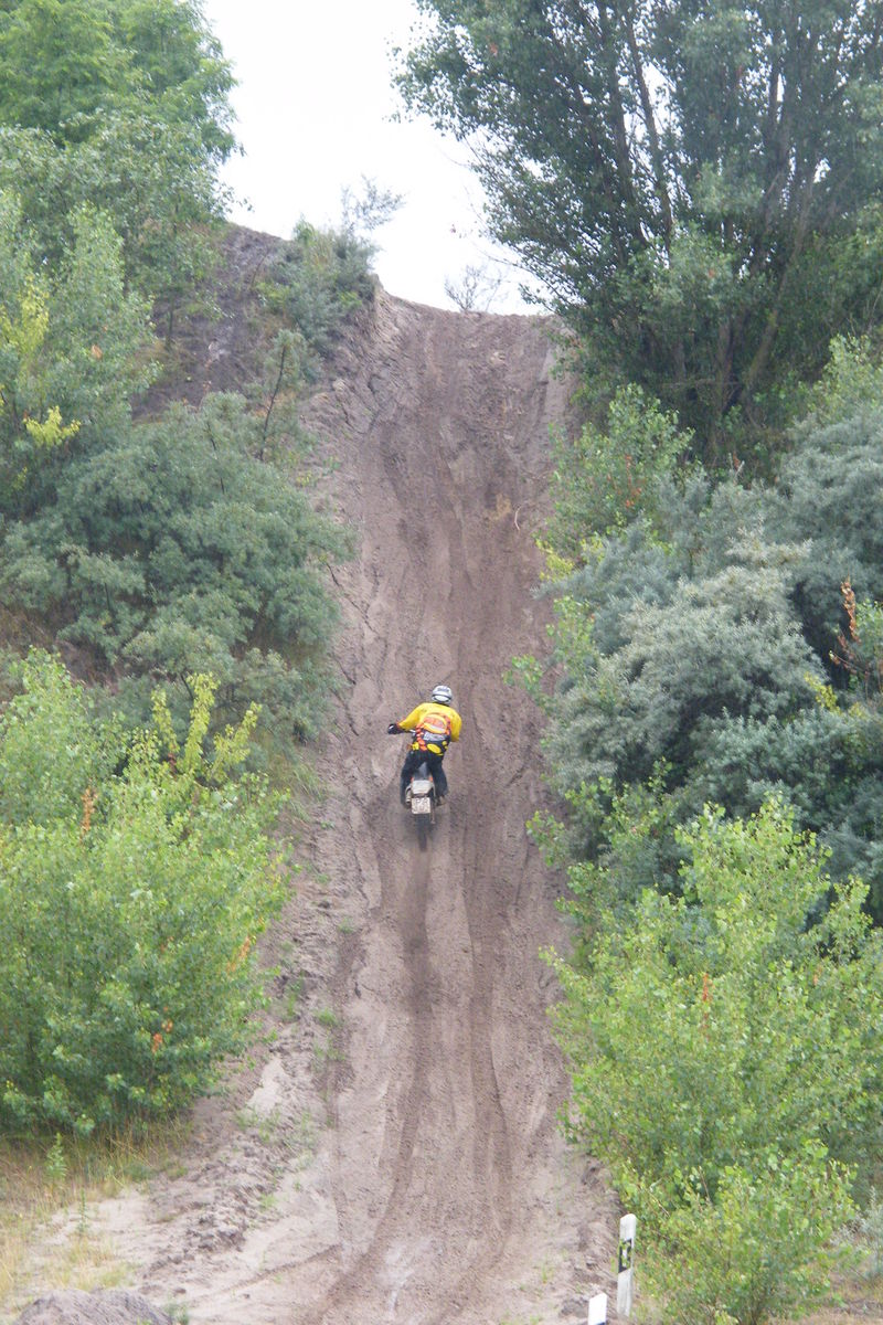 Die meisten Teilnehmer kamen tatsächlich von der BMW NL Dresden. Nette Leute, vom Anfänger bis zum Kamikaze war alles dabei. Wir paar KTM-Fahrer haben uns richtig gut mit den Q-Boys vertragen. Die fahren im November nach Tunesien, Dünen absurfen. Für das Training mit dem Scheffi hat die NL Dresden jede Menge lecker Leihmopeds rangeschafft, schöne neue 650 GS und sogar zwei G 450 X. Die 450er brüllen ja wie Hölle! blink Die würde selbst ein schwerhöriger Oberforstrat kurz vor der Pensionierung aus 5 km Entfernung kommen hören. Für heimliche Ausfahrten völlig ungeeignet.