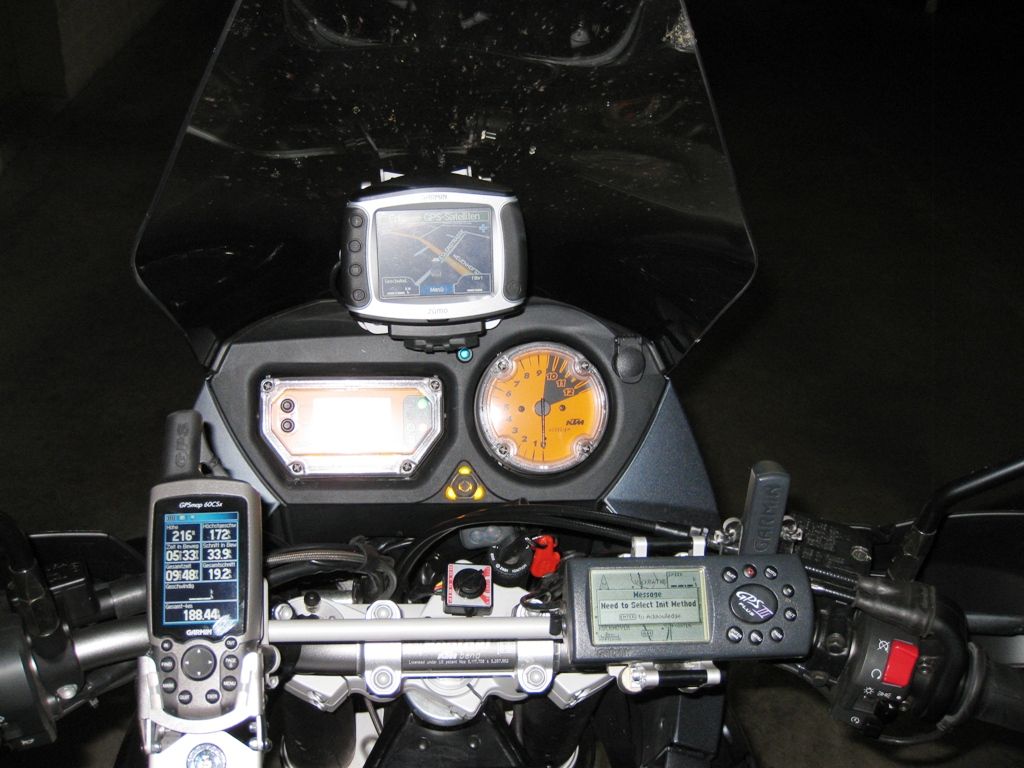 Für mein altes GPS III+ habe ich aus einem Stück Alublech und zwei dicken Dichtungsgummis selbst ´ne Halterung für die Lenkerstrebe(höhenverstellber, je nach dem, ob mit oder ohne Tankrucksack unterwegs!) gebaut. Kein Diebstahlschutz, funzte aber prima.