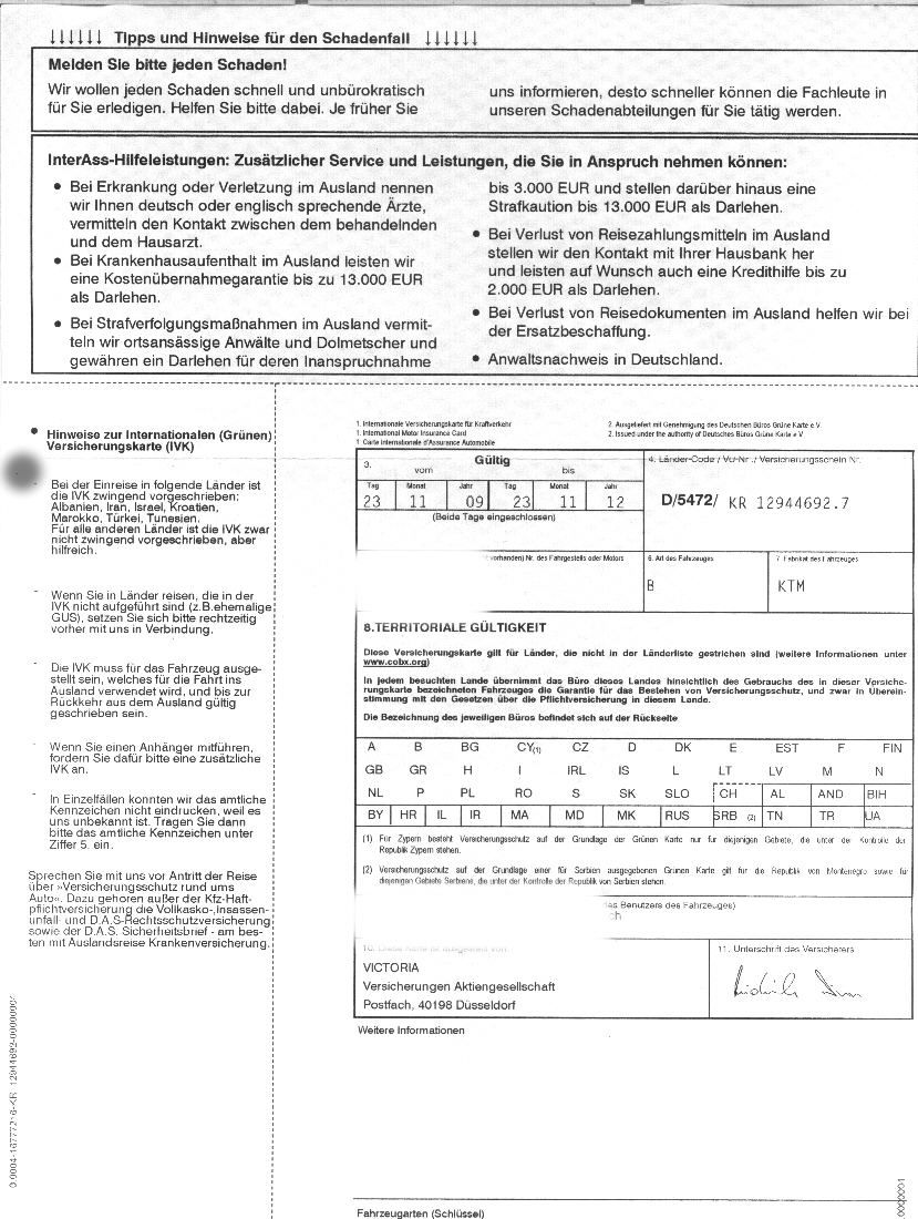 so, ich hatte mich, wie gesagt, an meine Victoria gewandt, um eine Schutzbriefleistung, wie vom Tourveranstalter gefordert, zu meiner Haftpflicht+Kasko zuzubuchen.