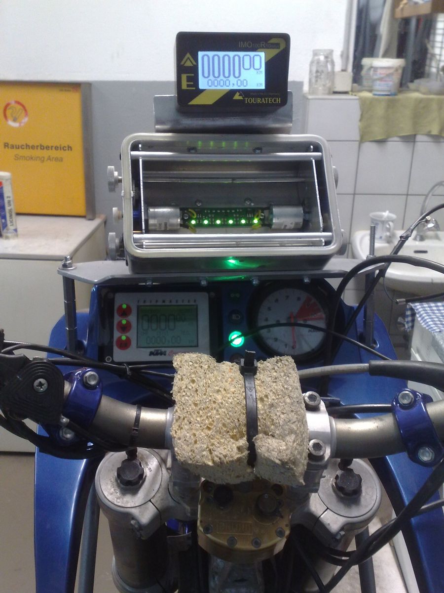 Darum blieb der Originalkram an seinem Platz, Navi und ICO oben auf's Cockpit unterhalb der Scheibe, Roadbook auf den Lenker. Die klobigen Schalter, die TD verwendet und die Motobau präferiert, habe ich nicht benutzt, sondern kleinere, da ich sonst Platzprobleme am Lenker gehabt hätte.