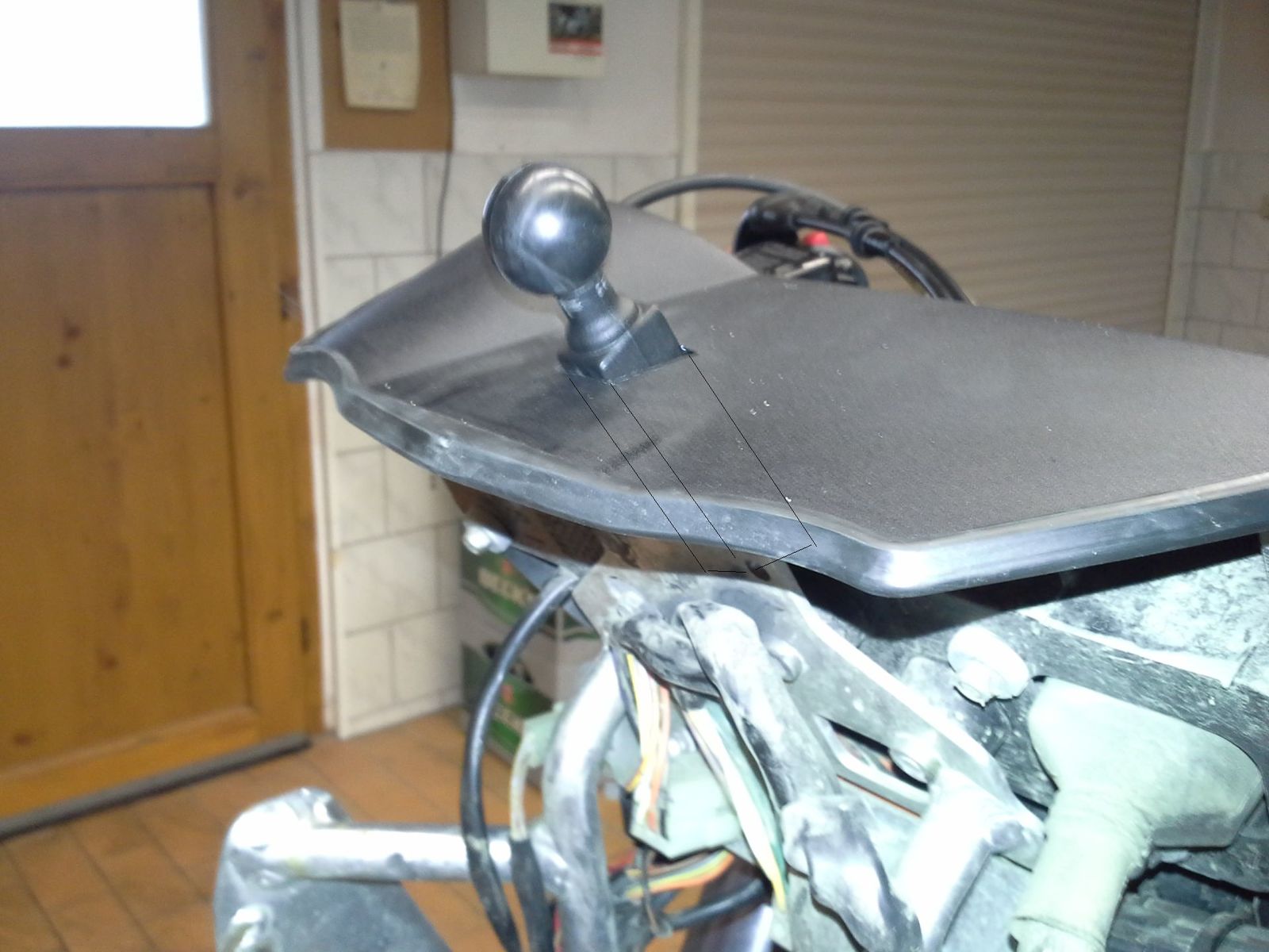 Ich habe eine der beiden oberen Schrauben der Cockpitverkleidung durch einen Ram-Mount-Kugelkopf ersetzt und da die Garmin-Halterung mit Stromversorgung dran.