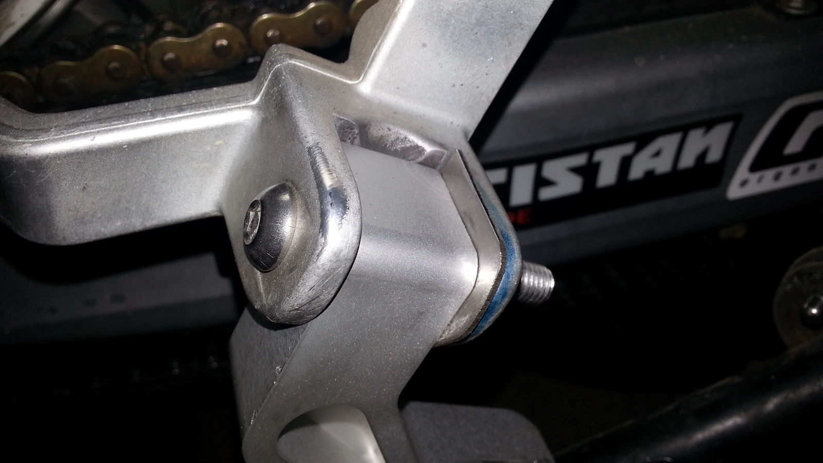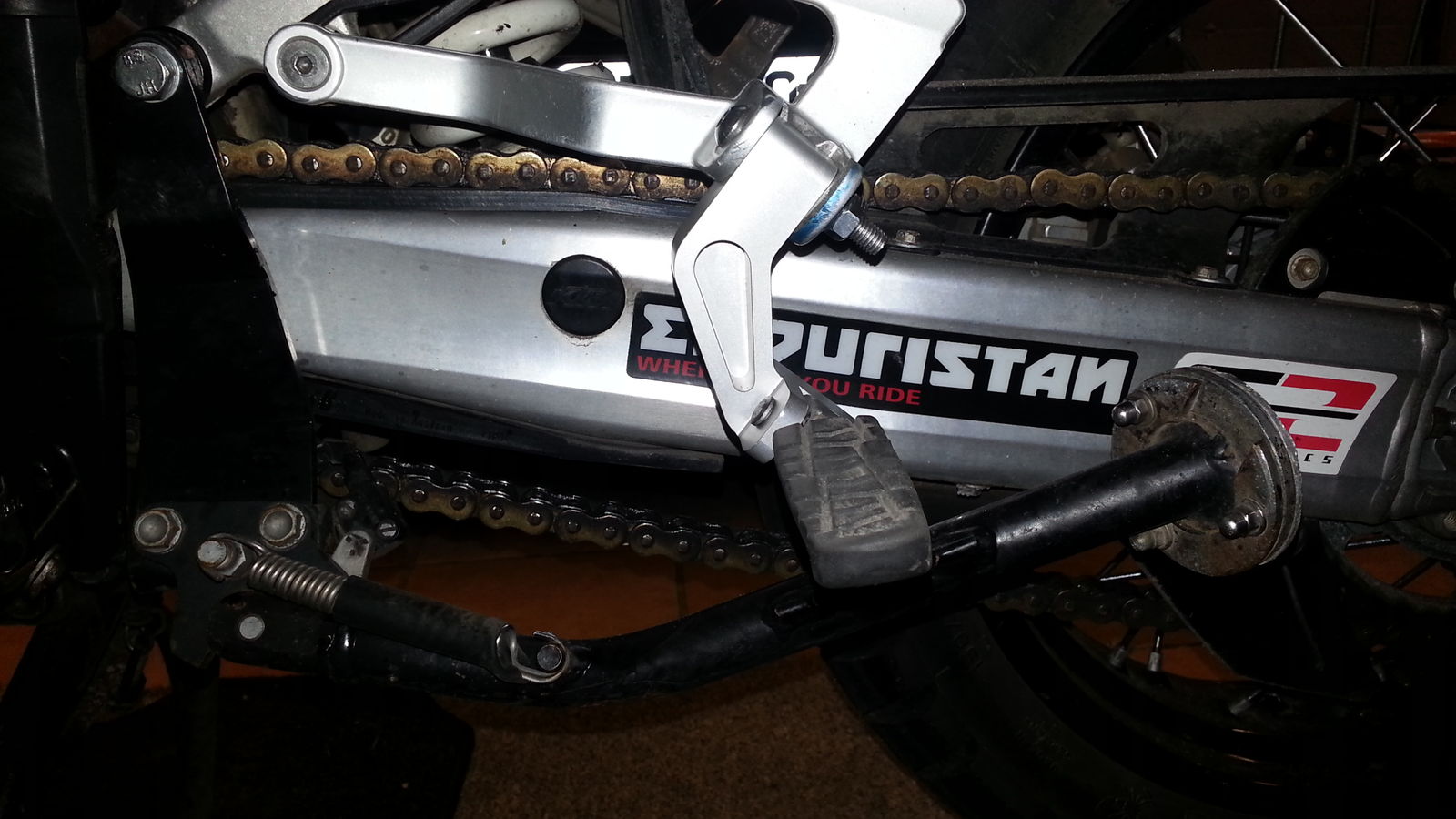 So, ging doch ganz fix. Der TT-Kit für die Triumph ist gestern eingetroffen. Heute hab ich´s gleich mal ausprobiert. Die Teile passen fast genau. Leider ist die Aufnahme an der KTM ein kleines bisschen zu breit. Hier habe ich mit einem 1,5mm Stahlblech nachgebessert. Das paßt saugend dazwischen. Ansonsten muß nur noch der 8mm Bolzen von TT etwas gekürzt werden - Feddisch! Die Rasten liegen ziemlich genau 8cm tiefer als vorher. In der Richtung nach vorn bleiben sie so unverändert. Ich habe allerdings den Seitenständer anders montiert, als beim Original. Dürfte aber auch da kein Problem sein.