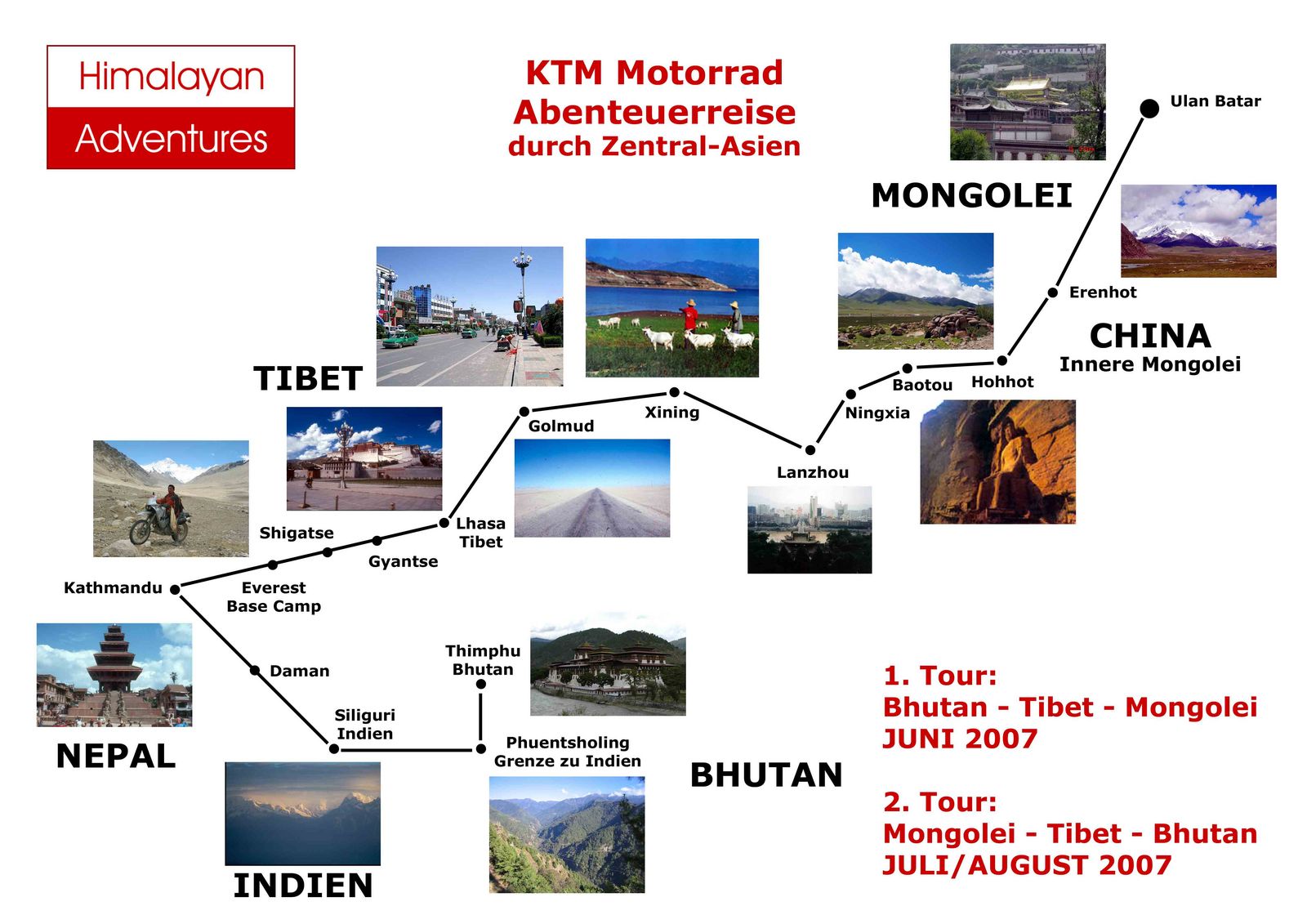 Nach langer und gründlicher Vorbereitung gehen wir im Sommer 07 an die Umsetzung unserer großen Bhutan-Westbengalen-Sikkim-Tibet-China-Mongolei-Enduro-Motorradreise, es gibt nur 14 Plätze bei dieser abenteuerlichen Weltpremiere!