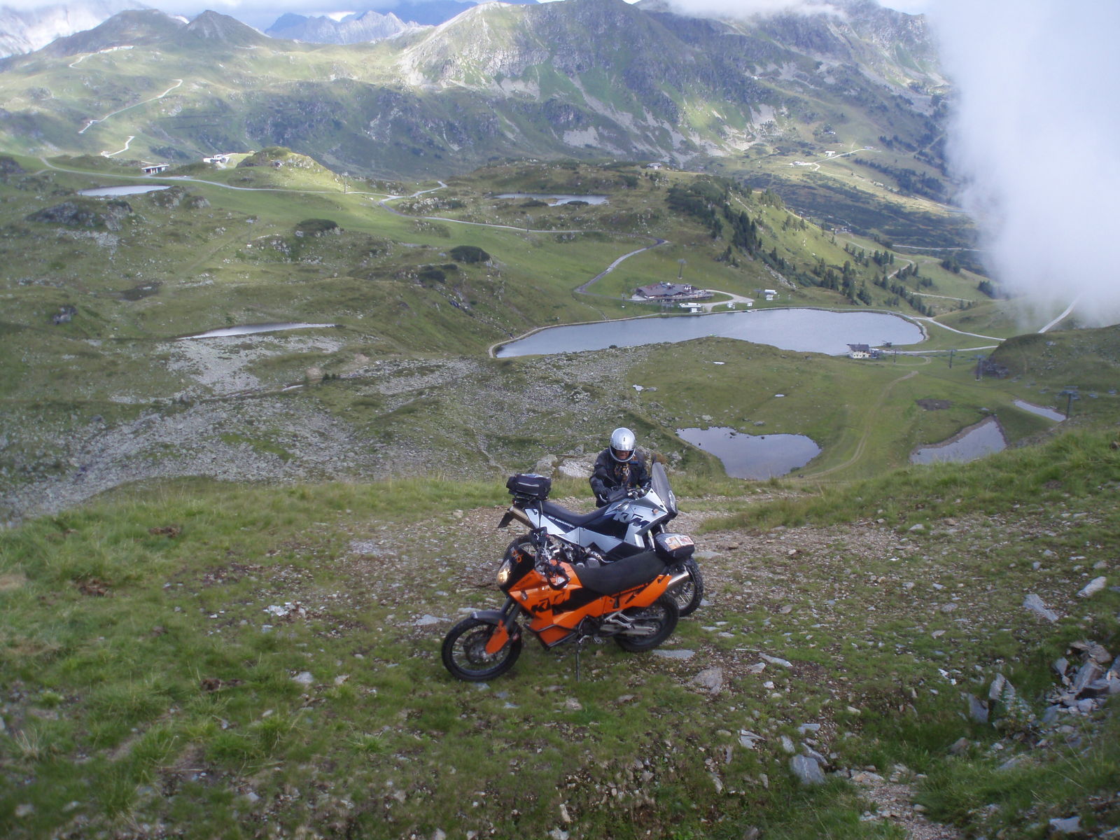 Inzwischen kristallisierte sich eine kleine Vorgruppe heraus. Während die anderen Gipfelstürmer in spé ihre Mittagsjause inhalierten, machte sich ein dreiköpfiges Grüppchen auf den Weg zum Seekareck. Streckenbeschreibung: „Im oberen Bereich wird sie sehr steil, und zwei nach außen hängende Kurven machen es sehr schwierig, ausreichend Schwung in die Steigung mitzunehmen.“ Der erste, der rauf wollte, schaffte das mit dem Schwung nicht. Er fuhr in die Garage, sprich er legte seine Adventure um, auf den fortan geknitterten Akrapovic und bekam dafür kräftigen Szenen-Applaus (sowie den Nachnamen Knitteric). Vor allem von denen, die angesichts von Barbaras Gipfelsturm schon blass gewesen waren und jetzt noch blasser wurden.