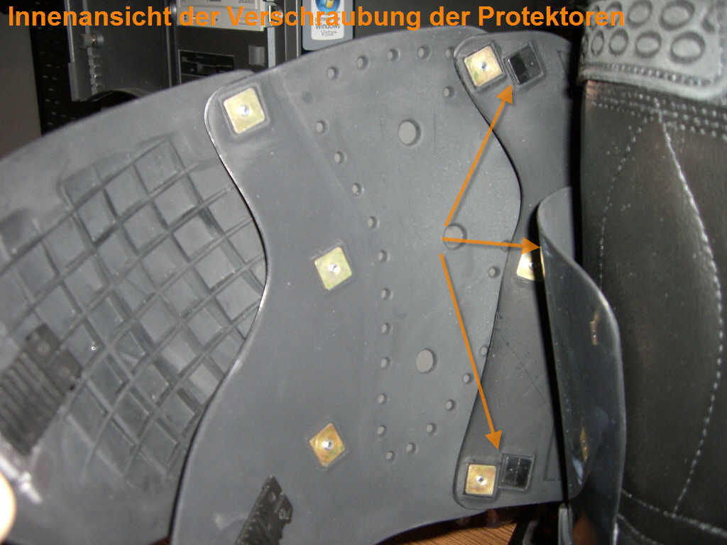 Ich habe Dir mal ein paar Fotos vom Stifel gemacht. Leider kann man bei dem die Protektoren nicht so wie von Dir beschrieben verstellen. Man kann zwar jedes Teil ein uns ausbauen, aber erweitern und verkleinern ist nur bei einem Plastikteil möglich, da sind 2 Bohrungen vorgegeben, siehe letztes Bild.