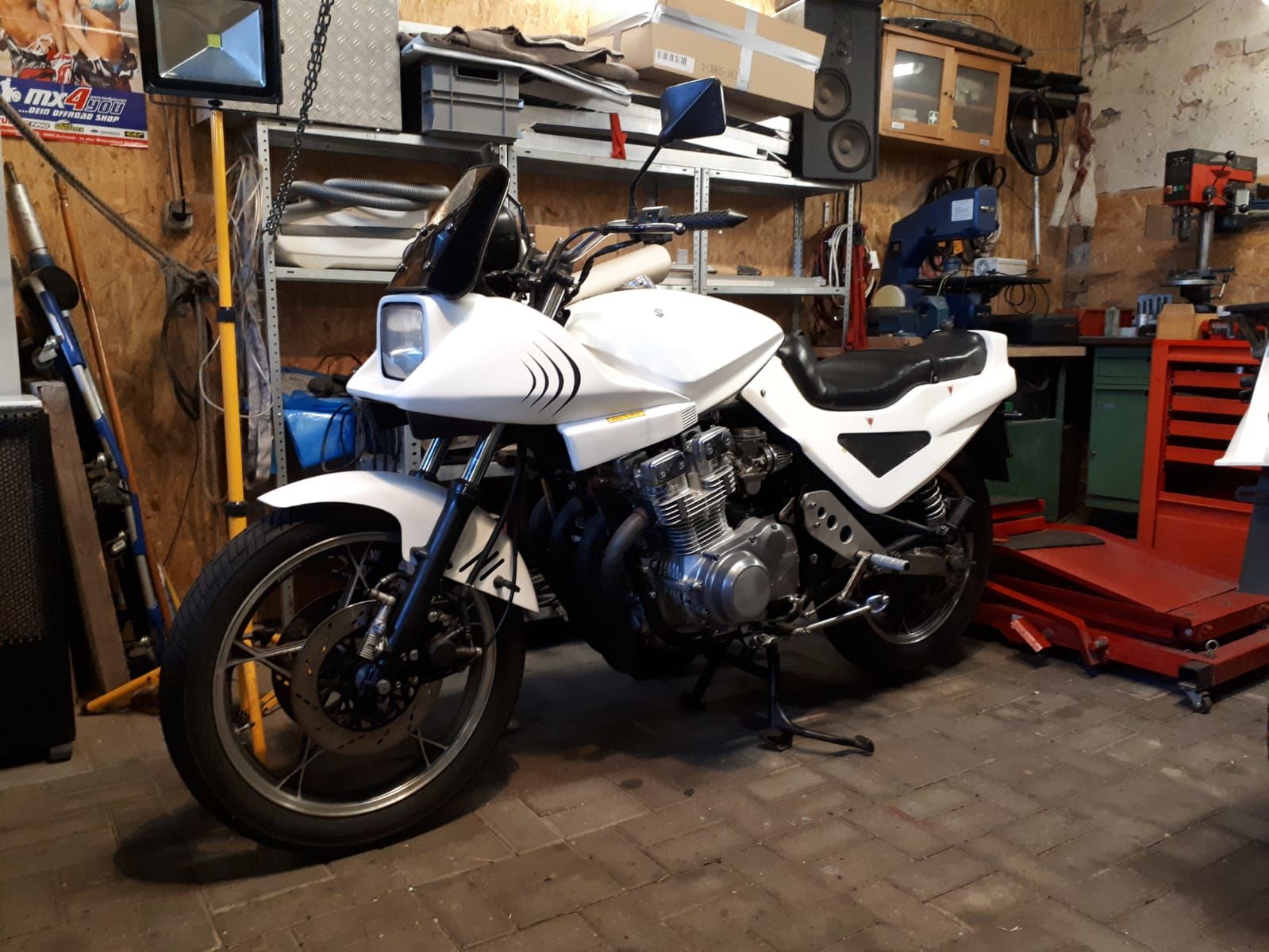 Zum Kaffee geht auch die alte Dame Susy, eine GSX 750 S Katana, 36 Jahre alt und frisch aufgebaut.