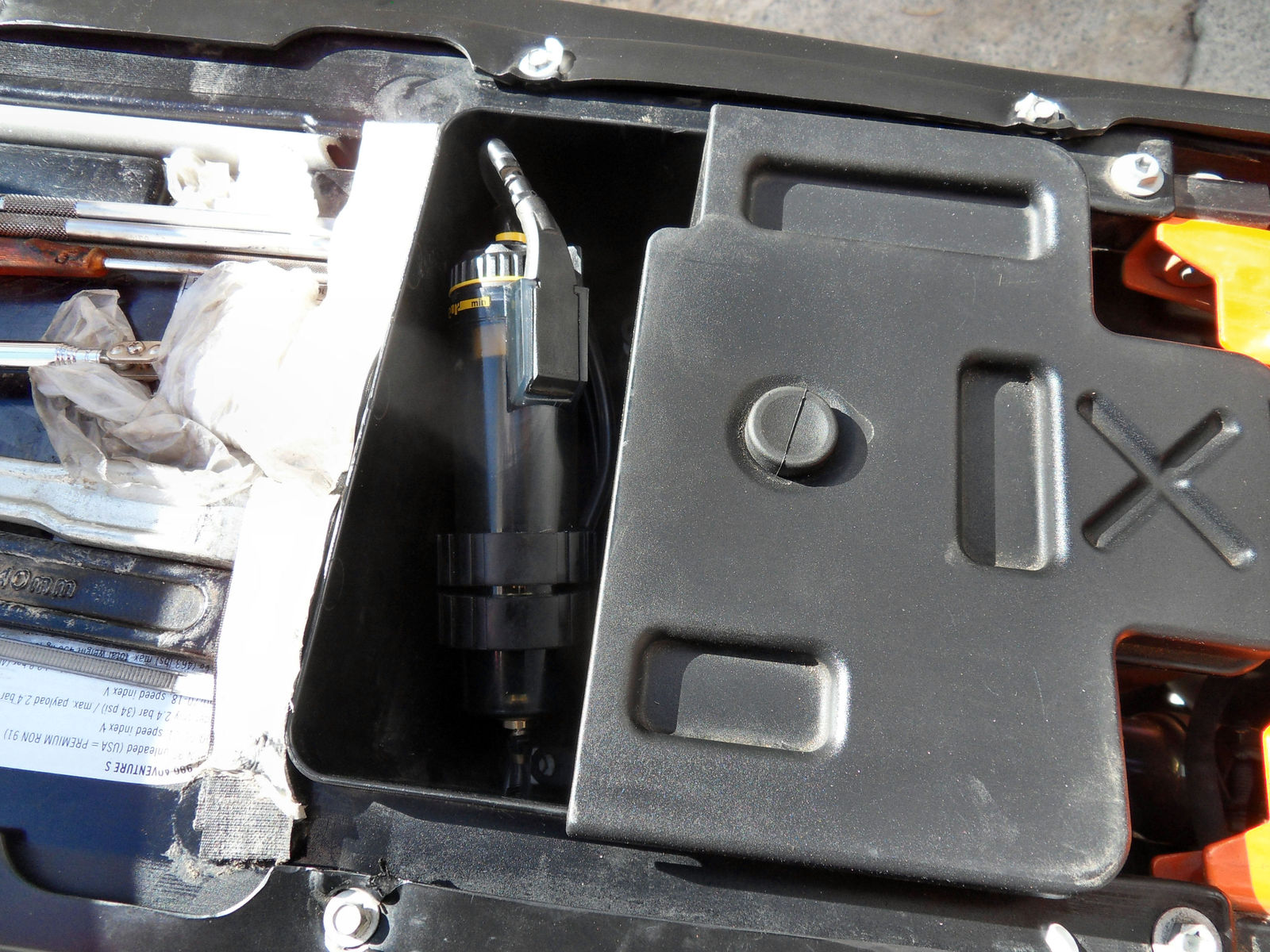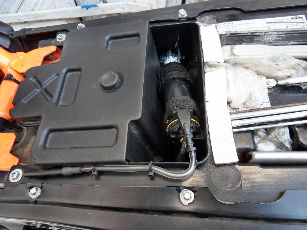 Ich habe den Luftschlauch-Verlauf etwas geändert. Scheint mir so besser gelöst zu sein, da der Schlauch nicht so eine starke Krümmung (nach unten) machen muß und auch wenig Gefahr besteht, das bei vollen Tank Öl (durch die Bewegung) in den Schlauch abfließt und so die Luftzufuhr behindert.