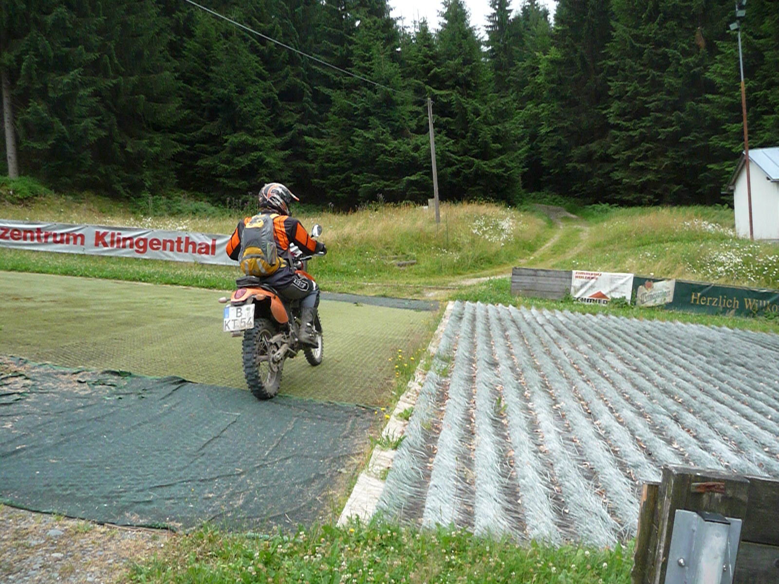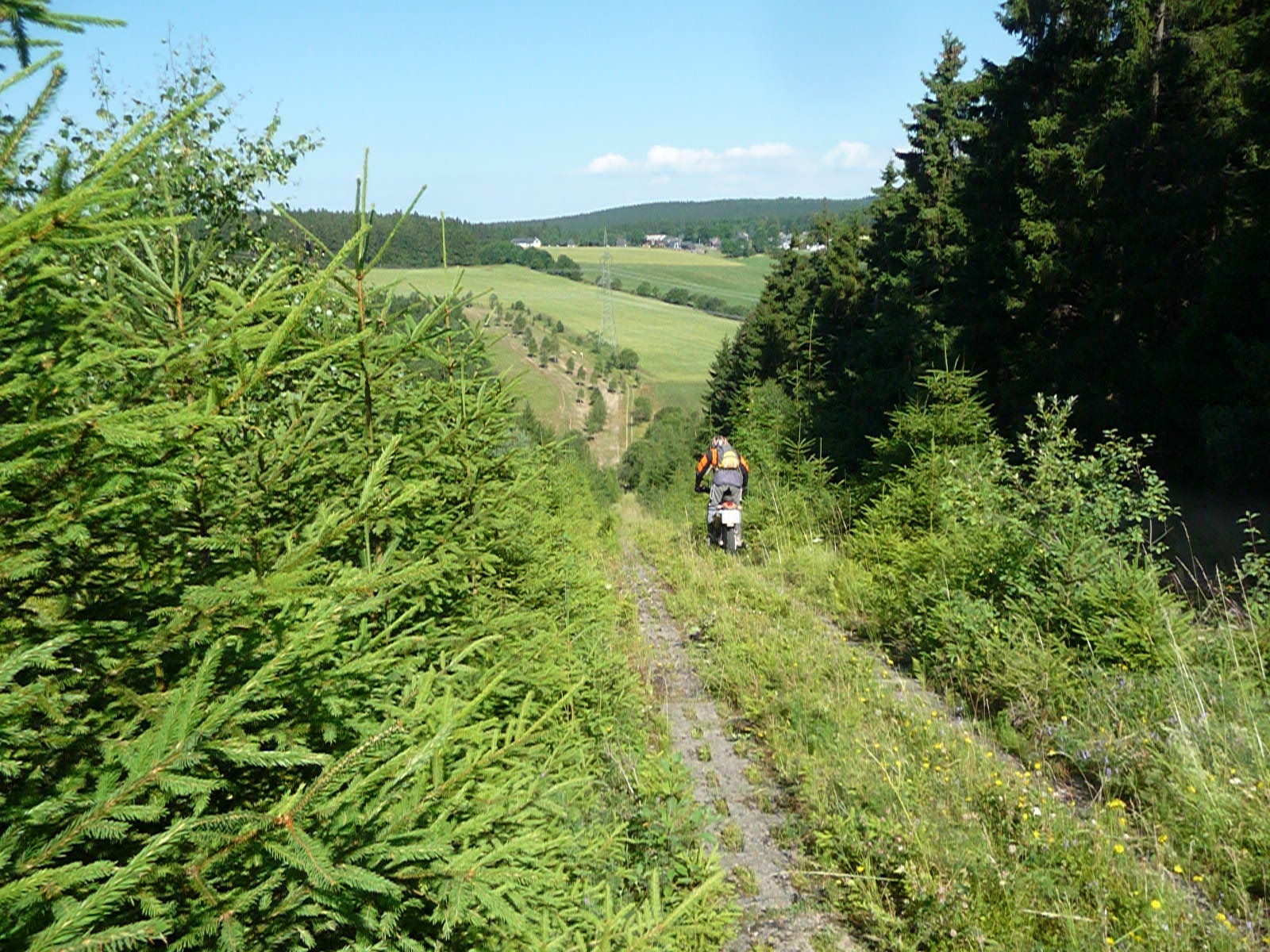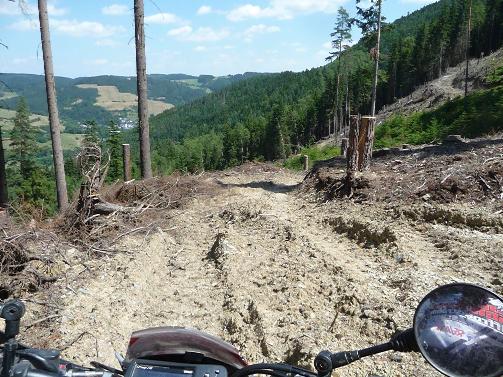 Mittwoch -wir beschließen die gestrige ausgelassene Tour stücke rückwärts zu fahren und nehmen noch bei Probstzella einiges Steilauffahrten - Mittag bei 34 Grad- der Erste Forstarbeiter der uns seines Waldes verweißt und über Land ohne Lotze zu treffen nach Middle East .Schöne neue anfahrt zur Waldschänke .