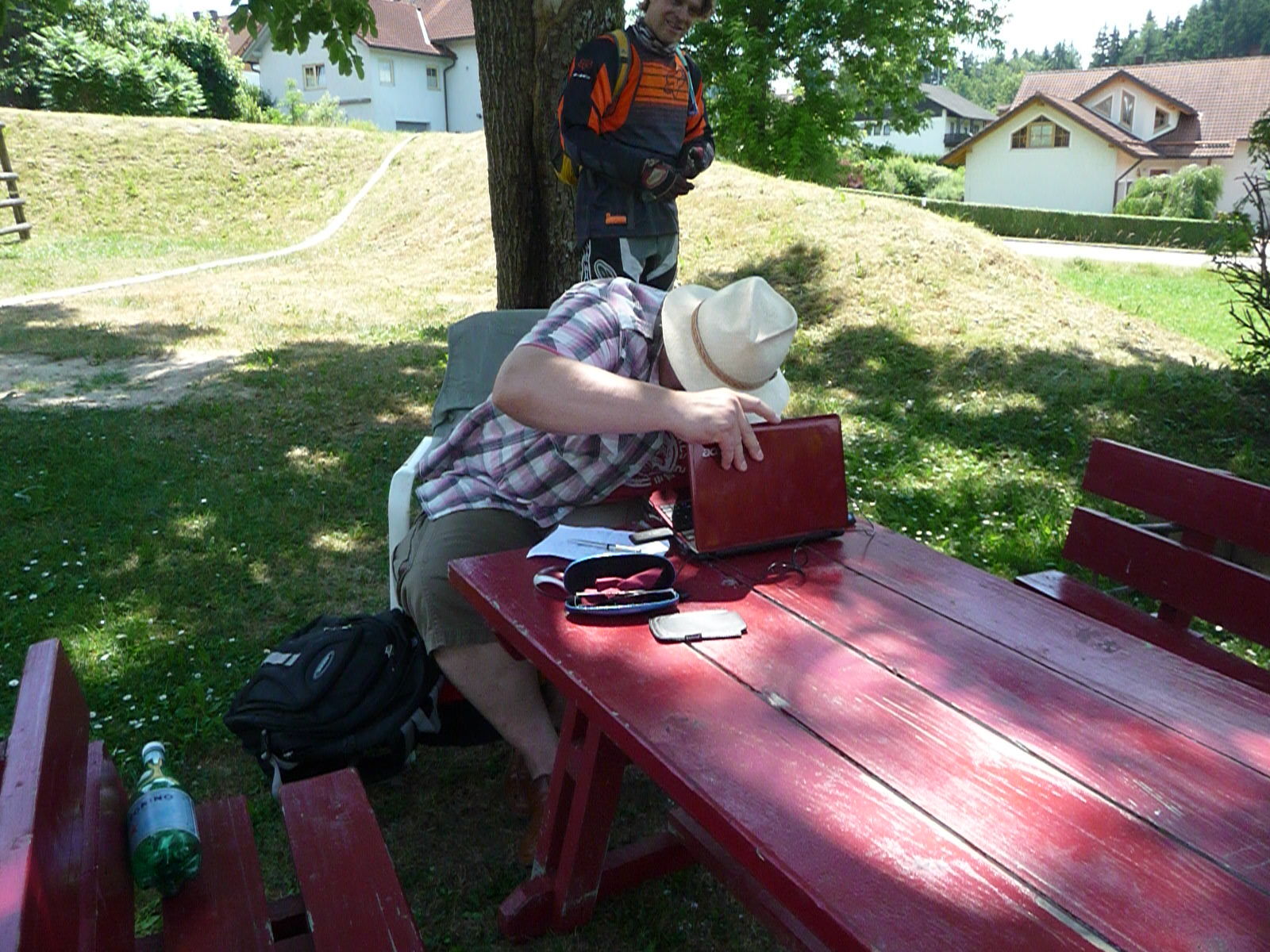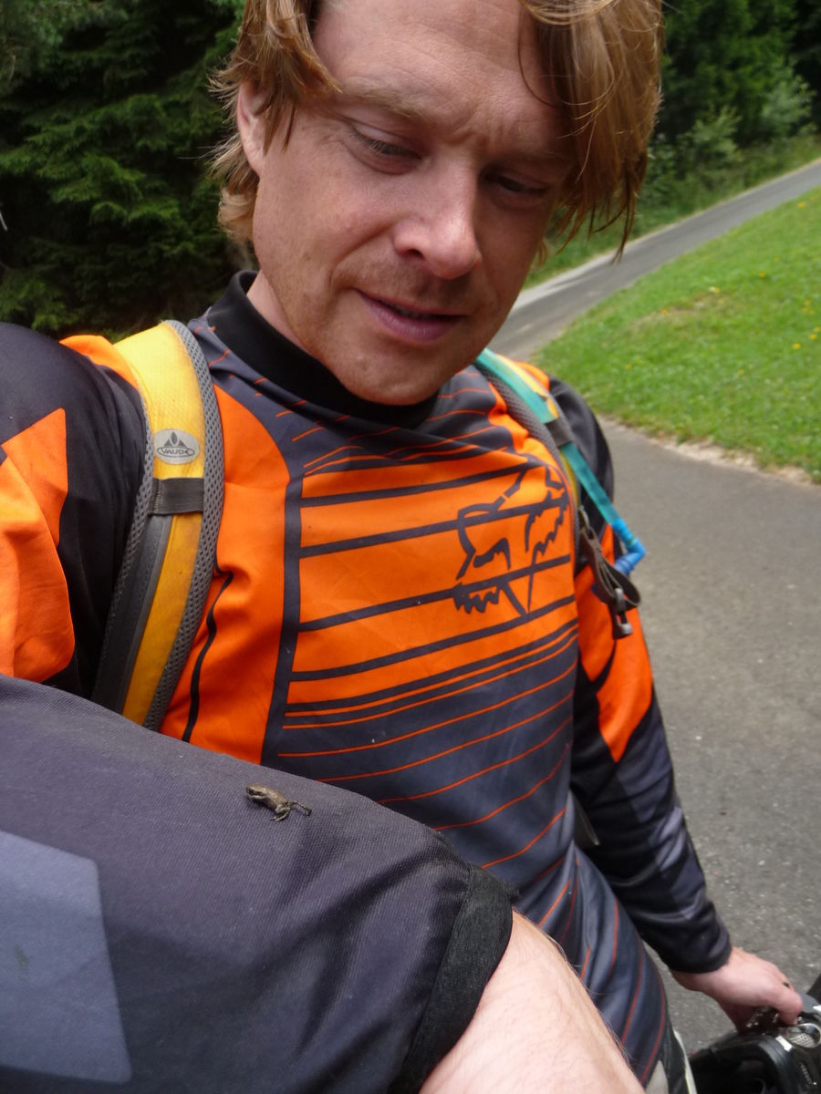 Während der Arbeit haben wir garnicht bemerkt das die Polizei die Landstraße neben uns gesperrt hatt e weil ein LKW umgestürtzt war - also haben wir uns Bergaufwärts die nassen Hänge vom nächtlichen Gewitter bei 200% Luftfeuchte hochgekämpst - 5 km gefahren beide am Ende- also beschließen wir uns Abkühlung auf dem Ochsenkopf zu holen .