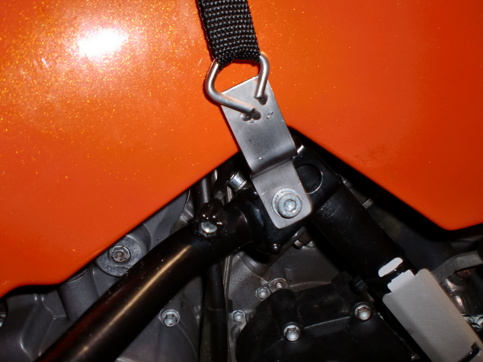 Mahlzeit, sehe gerade das Ihr die Rucksack Riemen unten im Rahmenrohr einhängt. Habe mir so eine Aufnahme gebaut, die am orig. Sturzbügel mit befestigt wird, da kann man den Riemen schön durchziehen.