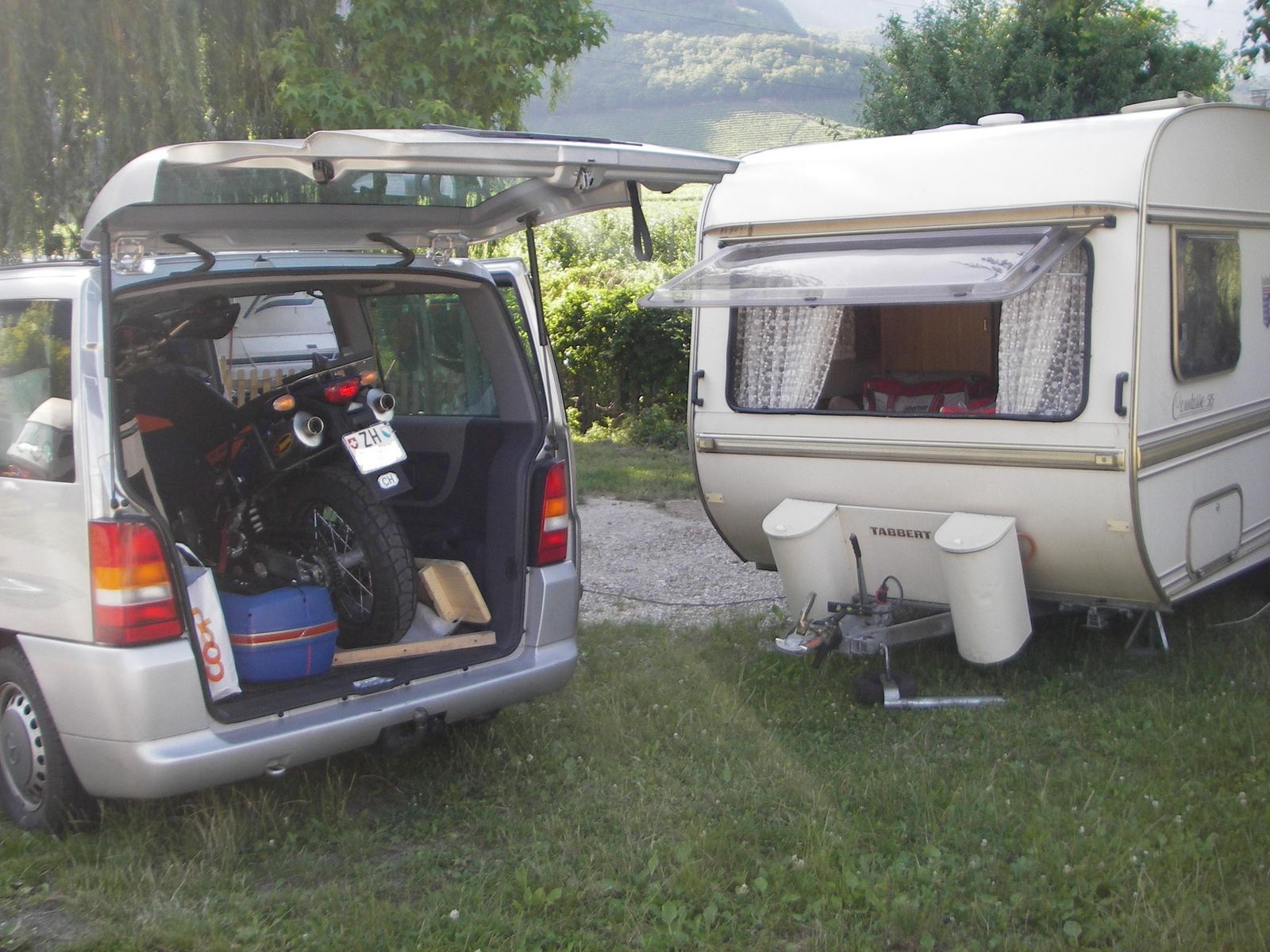 Ich hab'n T4 Kastenwagen mit Hochdach (Womo-Ausbau) an den ich einen Motorradtträger von Cate montiert hab. Ich bin gerade dabei, die Schiene noch etwas zu verlängern, da ich bisher nur die LC4 damit transportiert hab. Die LC8 hat einen etwas längeren Radstand, deshalb der Umbau. Ich hab den Cate jetzt schon seit vier Jahren und find das Ding recht praktisch. Man kann ihn, bis auf die Ausleger unten, komplett demontieren und den Wagen dann bei Bedarf ganz ohne fahren.