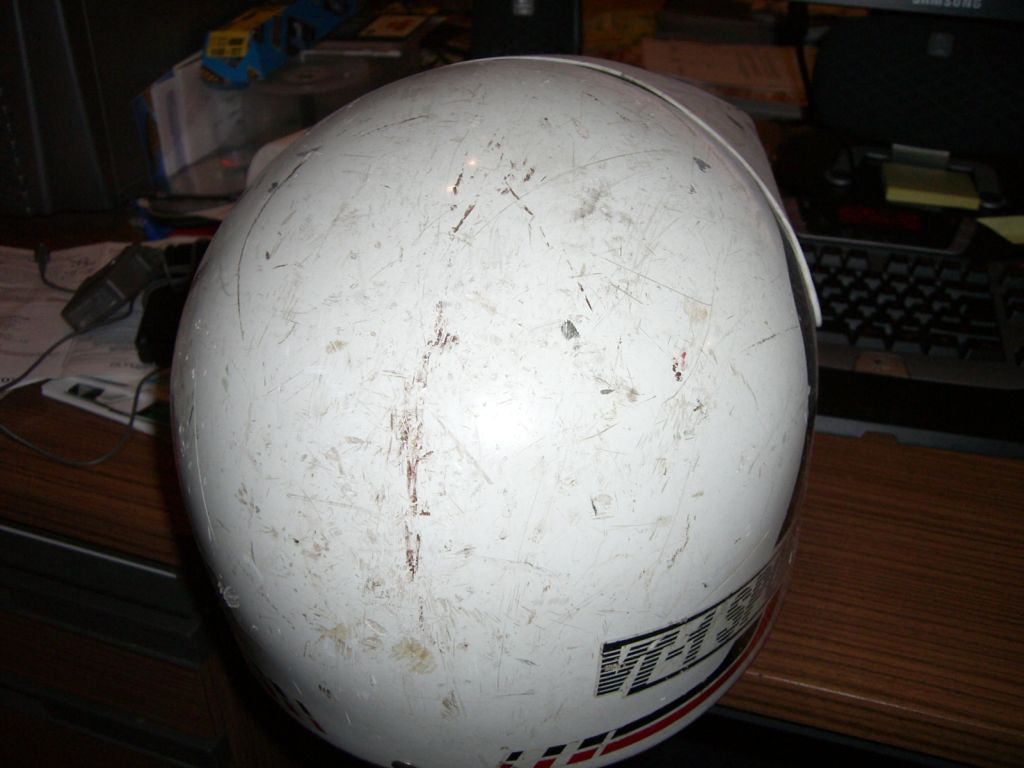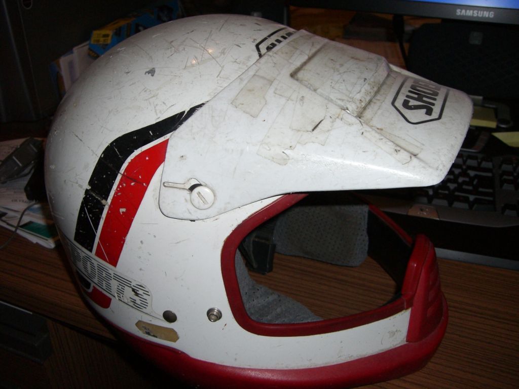 anbei ein paar Fotos von meinem alten Helm (Shoei, ca. 15 Jahre alt); 2006 habe ich mir zur neuen SE aber auch einen neuen Helm geleistet - man weiß ja nicht ob der alte sich nicht irgendwann von selbst auflöst hätte... blink