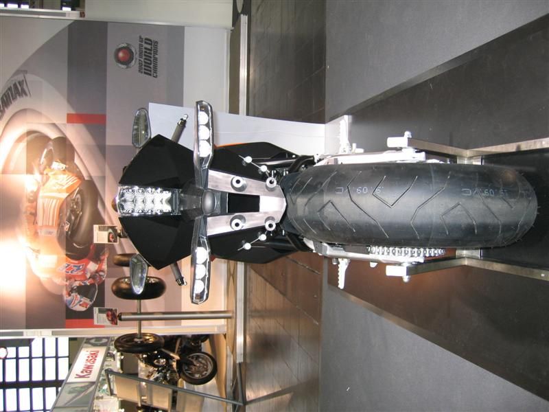 Bei BMW das übliche Reisedampfersammelsurium,neue 450 sieht gelungen aus, nur Vorderkotflügel/Lampenmaske wirken billig und wollen nicht recht zum Rest passen.Die GS800 ist ganz OK,ist denke ich ne gute Kiste ,zum offroadeln muß man aber wieder einiges umbauen und die Karl-Dall-Lampeneinheit gefällt mir schon an der 1200 nicht.HP2 Sport ist schon ein Blickfänger,haben aber wohlweißlich kein Preisschild dran gemacht.