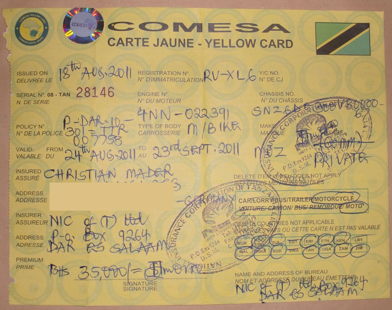 - einer US-Versicherung (Insurance company of the State of Pennsylvania), die ich zusammen mit dem Moped-Flug nach Südafrika beim Reisebüro gekauft hatte (GS-Sportreisen). Kosten: ca. 150€ für 3 Monate. Hätte in Südafrika und Namibia gegolten.