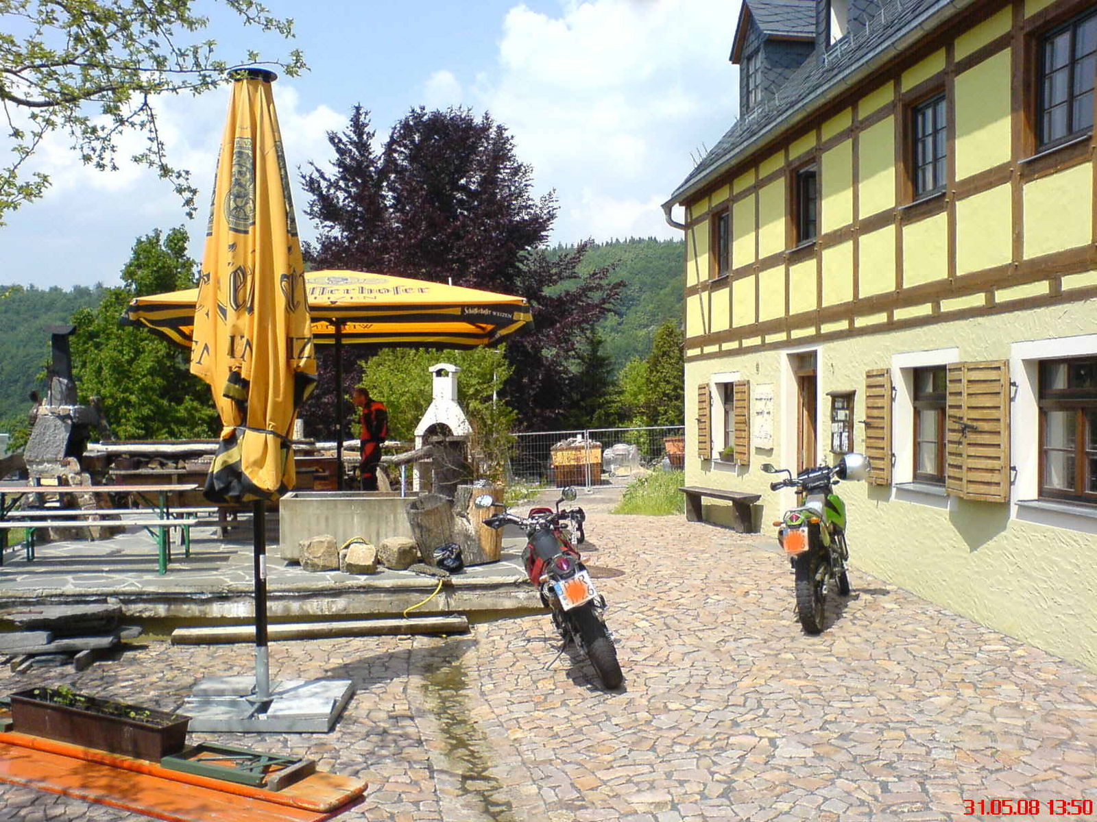 Weiter über Hrensko-Bad Schandau-Hohnstein-Pirna und wieder zum Bikertreffen mit Band und Steaks vom Grill und selbstgebackenen Kuchen. Zuhause im Trockenen gegen 21 Uhr angekommen traute ich meinen Augen nicht: Da wo ich immer mein Motorrad abstelle, lagen etwa 30 cm Hagel und alles war mit heruntergerissenen Blättern bedeckt, sowas hab ich noch nicht gesehen.