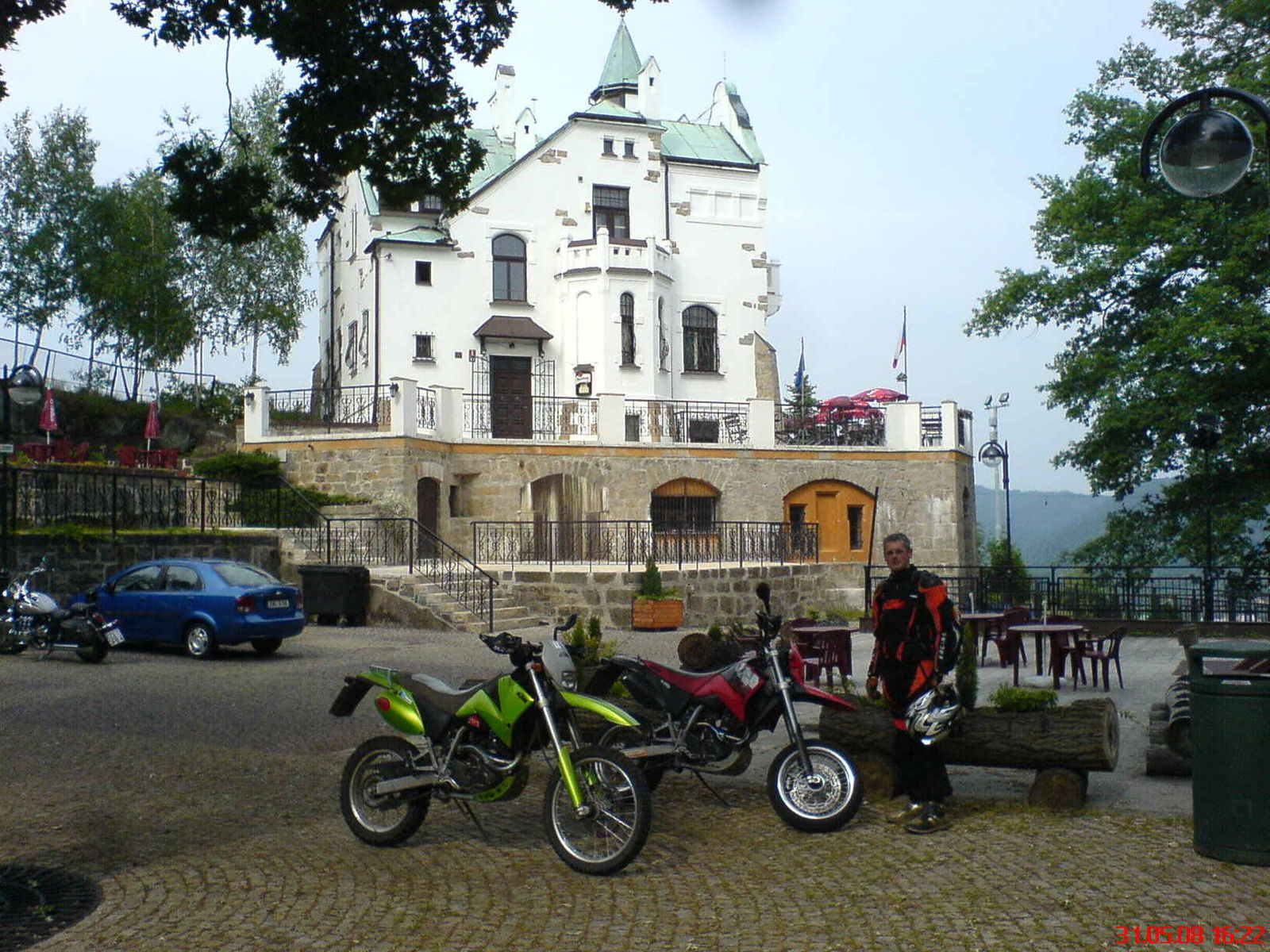 Über Dipps und Talsperre Lehnmühle gings gemütlich nach Rechenberg-Bienenmühle, hier fuhren wir am Museum vorbei, weil uns der Hunger packte. In einer liebevoll aus Holz gestalteten Bikereinkehr gabs Kaffee und zwei dicke Sück Kuchen. Weiter über Altenberg-Geising, irgendwo begegnete uns in einer entgegenkommenden Gruppe eine orangene LC8 Adv, nach Bahratal ins Tschechische über den angenehm kühlen Erzgebirgskamm runter nach Decin. Hier gabs auf dem Schloss mit herrlichem Ausblick einen Eiskaffee.