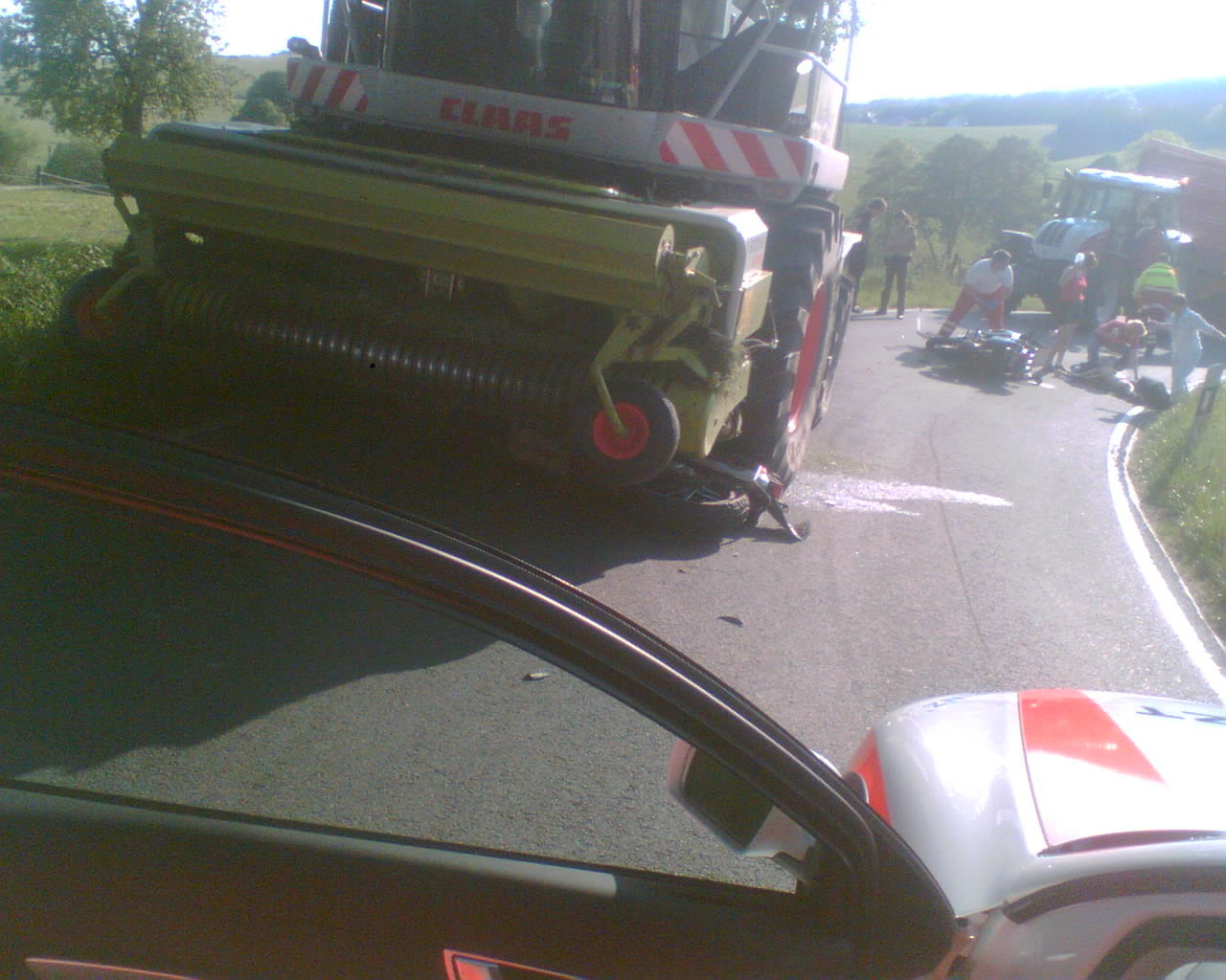 Der Erste muß wohl idiotisch schnell um die Kurve gerauscht sein , um dann eine Panikbremsung hinzulegen u. die Mähmaschine zu rammen , -und der Zweite wahrscheinlich mit ein paar Metern " Sicherheitsabstand" gleich hinten drein Mr. Green Wie blöd muß man sein um dieses Riesengerät zu übersehen???
