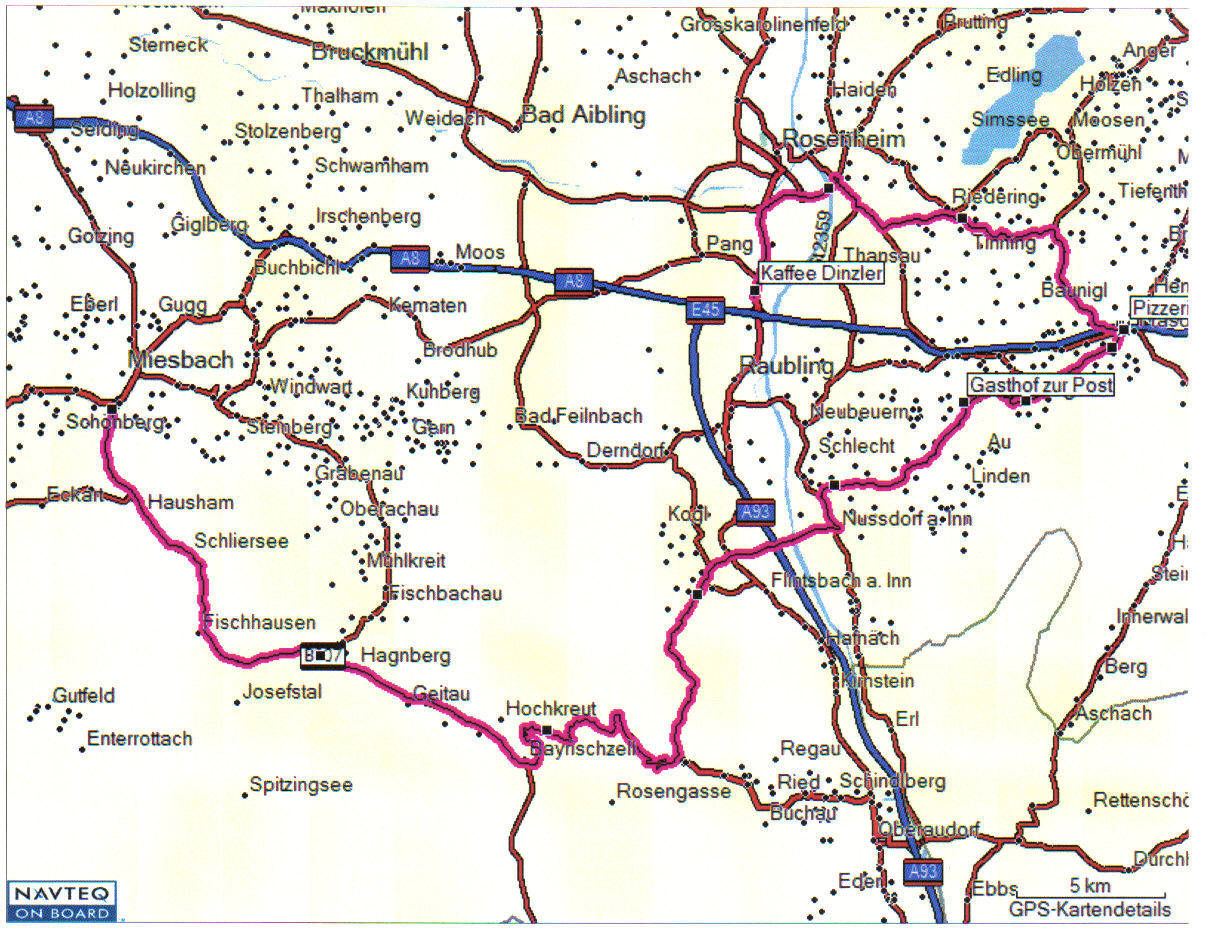 also man geht von der A 8 in weyarn oder irschenberg ab - in richtung miesbach. hier fährt man erst mal richtung schliersee und dann richtung bayrischzell, weiter richtung tazelwurm übers sudelfeld und dann vorher in die kleine mautstrasse richtung nussdorf am inn. dort links halten und nach ca. 1,4 km rechts ab richtung samerberg/törwang (dort ist z.b. der gasthof zur post - tourenfahrerhotel - sehr nett- sehr gutes essen), dann weiter die Ro9 und nun kurz vor wiedholz starke rechtskurve und nach ca. 300 m wieder links richtung wenk. weiter bis frasdorf - bis zur hauptstrasse und dort links abbiegen auf die simsseestrasse - das ist die St2362 (an der ecke eine gute pizzeria mit holzofen - sehr empfehlenswert) dieser strasse immer richtung rosenheim folgen.