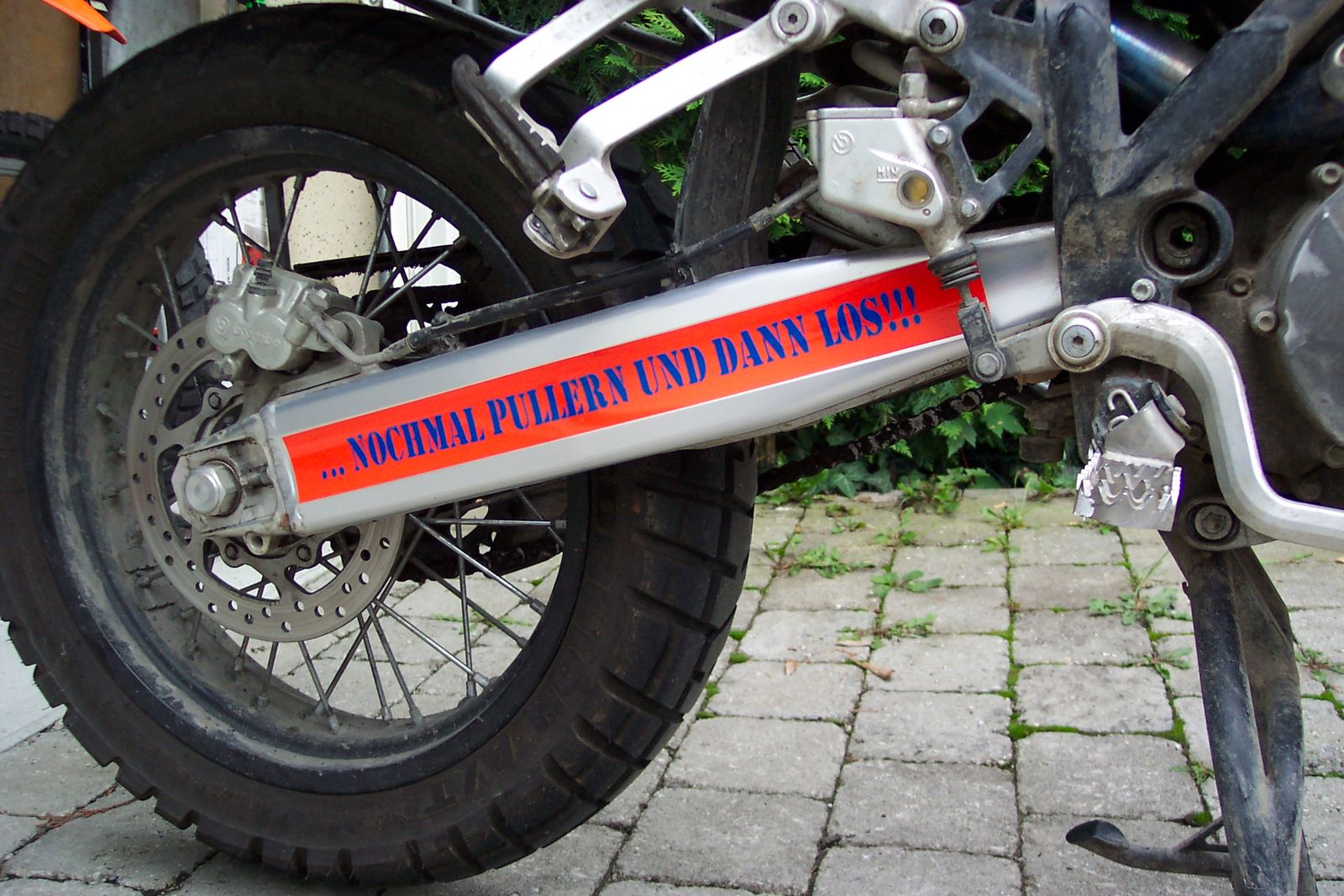 Ich habe das KTM-Logo auch aus Reflexfolie ausgeschnitten und auf meinen Ortlieb-Rucksack geklebt, auch zur Sicherheit.