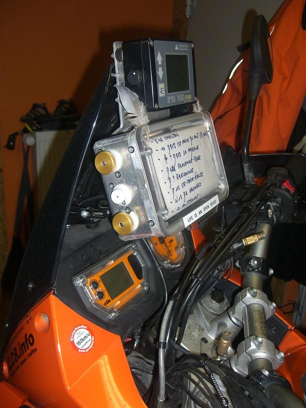 -Fernbedienung ist die Rallye 5 von Touratech, mit den 3 Knöpfen für die Bedienung des IMO und den 2 für's Roadbook (siehe erstes Foto, linke Lenkerarmatur) . Ich bevorzuge nach wie vor den Wippschalter, allerdings war der nur beim MD-Roadbook klasse, den von Touratech kannst du getrost..... sagen wir mal vergessen