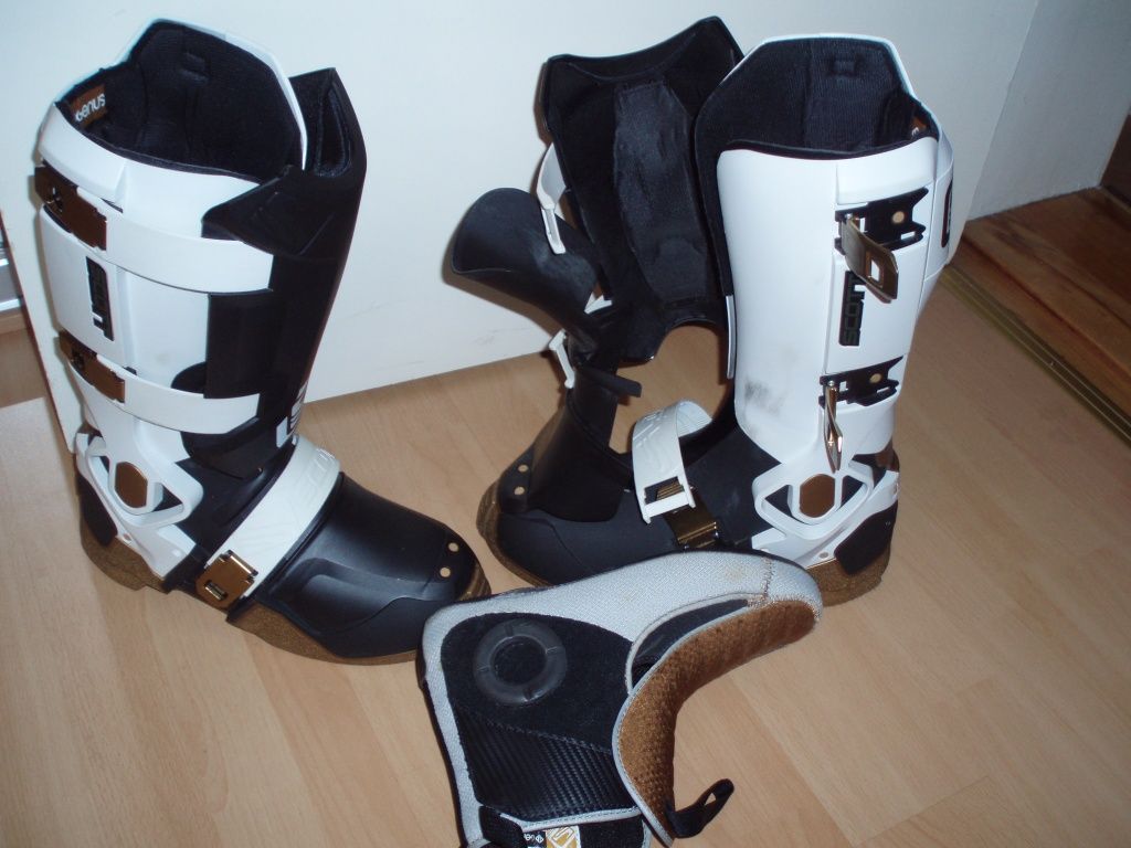 die Scott Genius MX Stiefel habe ich gerade für die neue Saison gekauft. Sie tragen sich wirklich nicht wie herkömmliche Endurostiefel, sondern wie Skistiefel. Längere Wege kann man damit nicht gut laufen. Man geht wie Frankensteins Monster in den Dingern. Sie sind mit 2 kg (Gr. 11) auch ziemlich schwer.