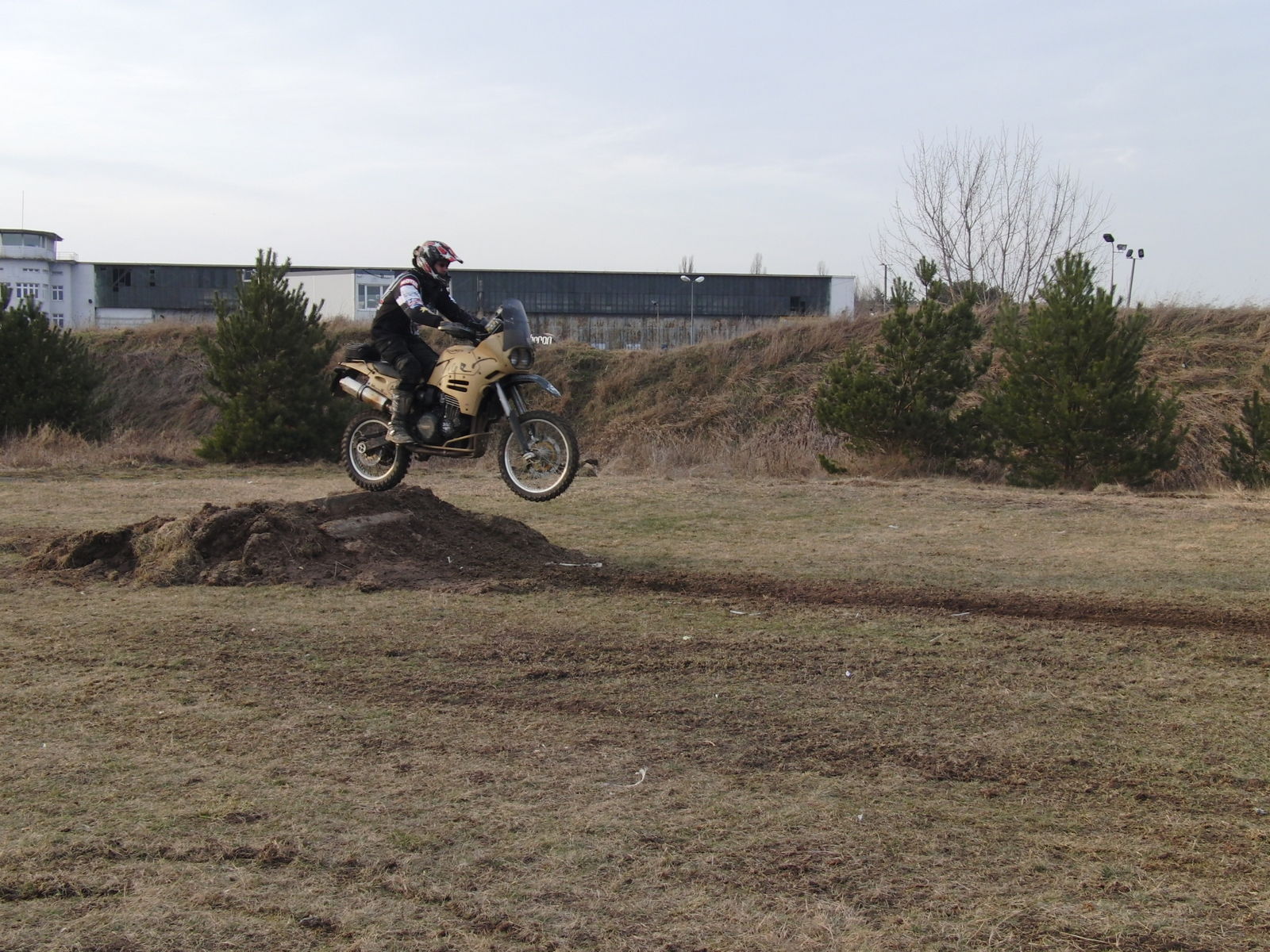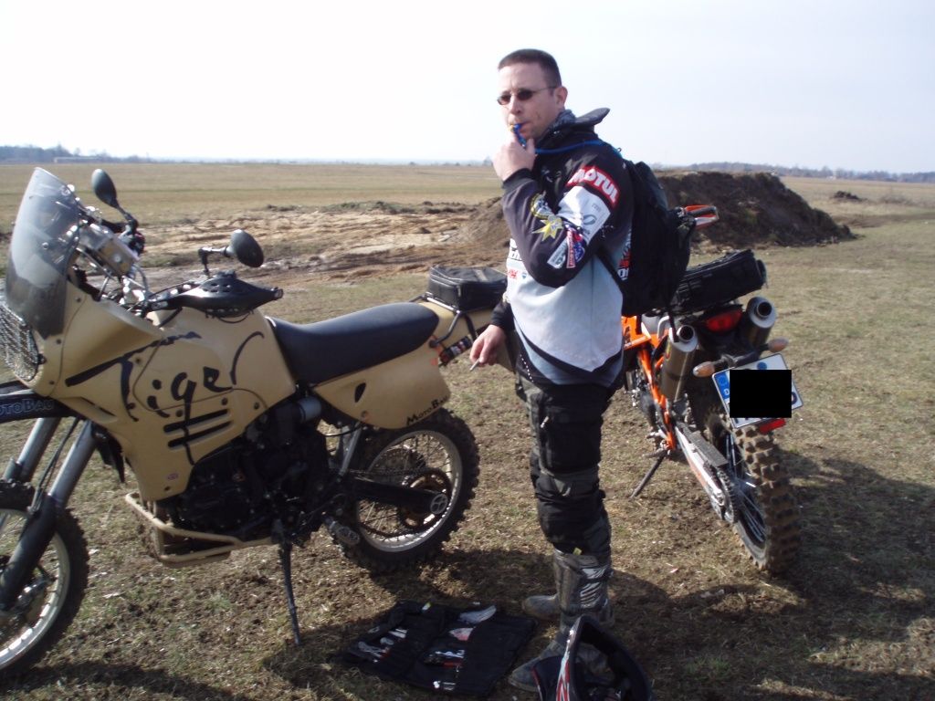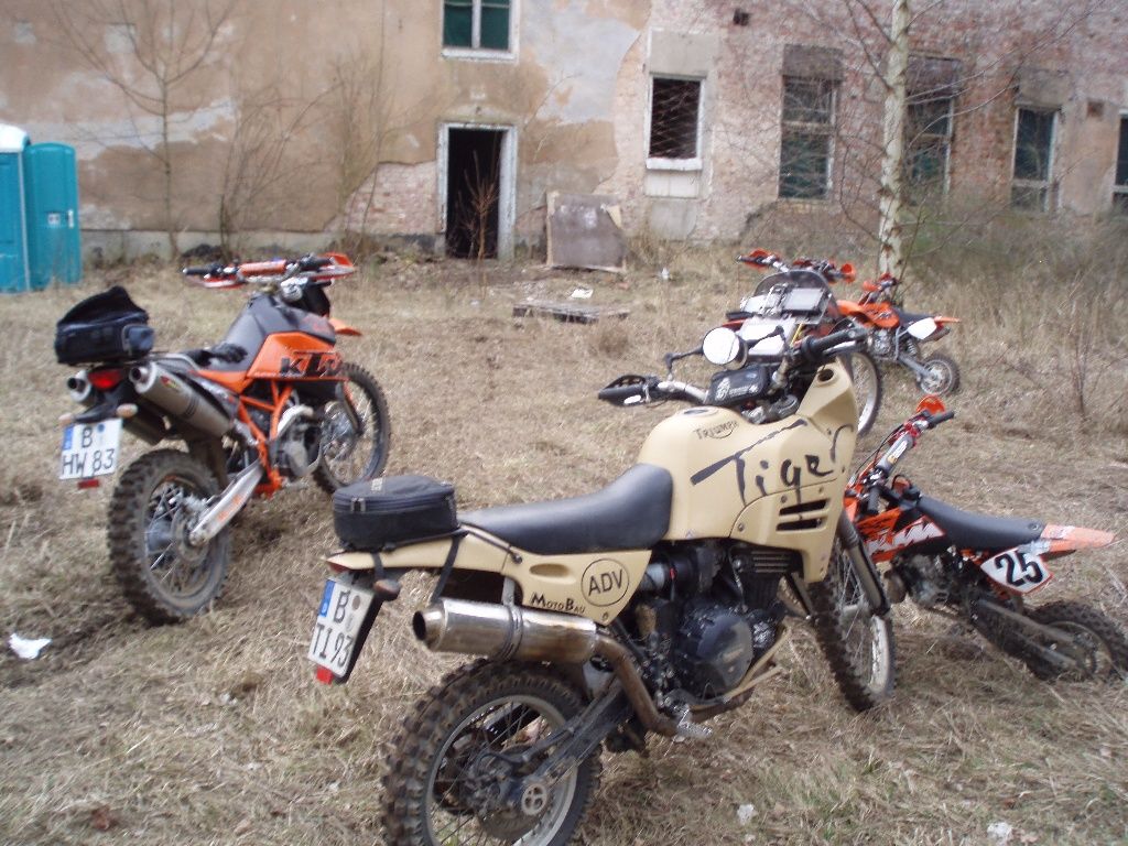 Rund um einen alten Militärflugplatz haben viele Helfer über Winter ein riesiges Enduroareal geschaffen. Einige von Euch werden es ja bei Ollos Grimmetreffen kennen lernen. Es lohnt sich! Da gibt es Tiefsand, Sprunghügel, Singletrails im Wald, Schlamm, Schotter ... am genialsten ist die Durchfahrt durch ein baufälliges Haus. In Jüterbog gibt es alles, was man sich als Endurofahrer freiwillig antun kann. Wir haben schon eine sehr seltsame Art, unsere Wochenenden zu verbringen. Wink