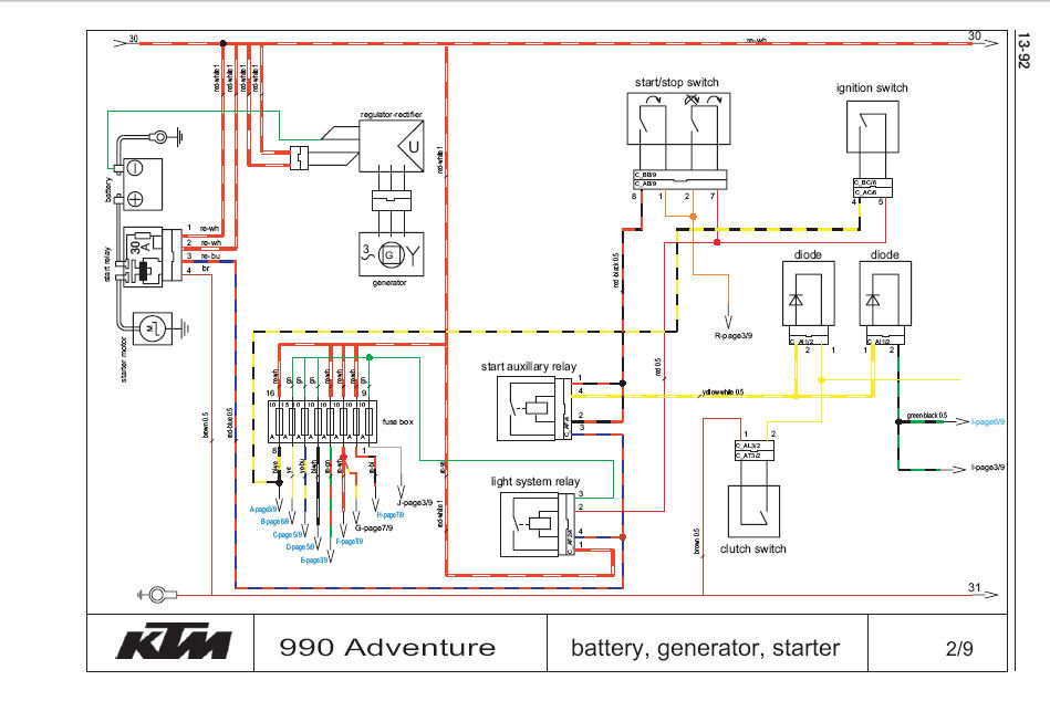Vermutlich findet man hier den Kurzschluss schon an Sicherung 1 (Zündschalter), dann muss man das gelb-schwarze Kabel weiterverfolgen -> NAch dem Zündschalter ist der Start/Stop Switch mit Anlasserschalter in der Reihe (rotes Kabel vom Zündschalter weg), dann kommt das Licht-Relais (auch rotes Kabel) und dann das Starter Zusatz-Relais (rot-blaues Kabel).