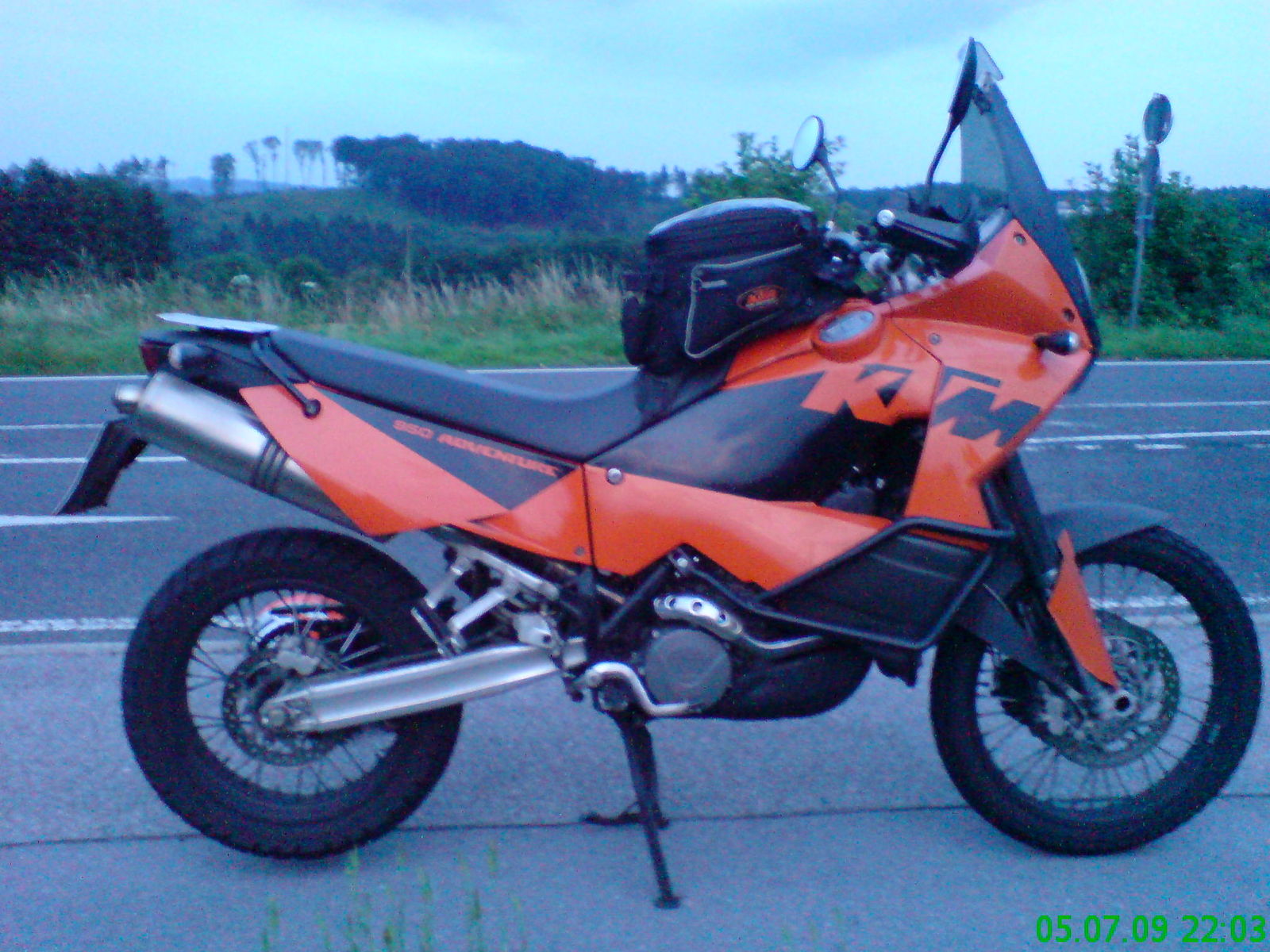Nach einer eher abtörnenden R1200GS Präsentation beim ortsansässigen BMW-Discounter kam mir der Gedanke mal bei KTM-Sommer vorbeizufahren,dort war grade Orange-Day.Als mein Spezi und ich dort ankamen konnte man die silberne 950er(OB-LC950 Wink )probefahren,hab mir dann noch von den wenigen(ja 2004)Rumstehenden einen Helm geliehen und nach 10 Min. die Pfälzer Str. im Wheely Mr. Green genommen,so daß mir klar wurde=so eine muß es sein Exclamation