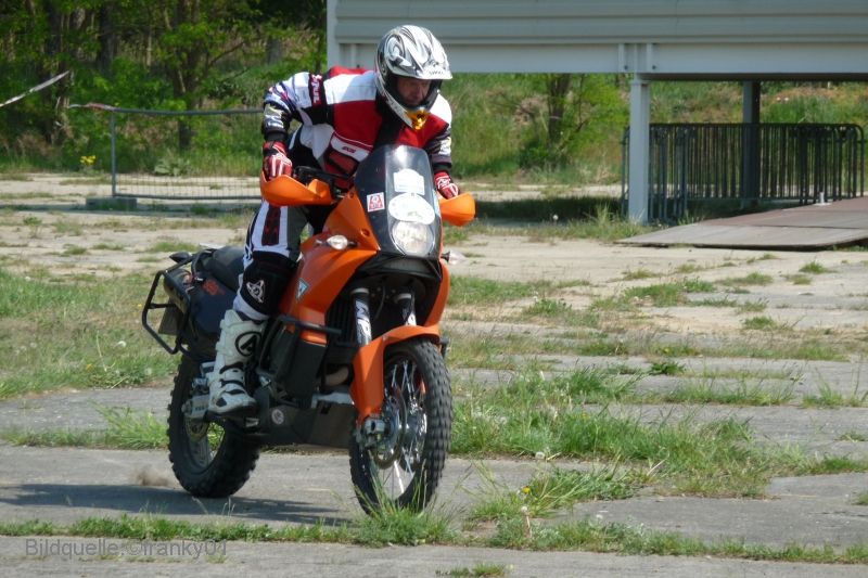 Mich irritiert etwas dein "Knie am Tank",ich weis ja nicht wie groß du bist,aber wenn ich(1,8Cool auf meiner stehe, bekomm ich nur mit allerlei Verrenkungen die Knie an den Tank,aber keinesfalls bei einer offroadtauglichen Position.