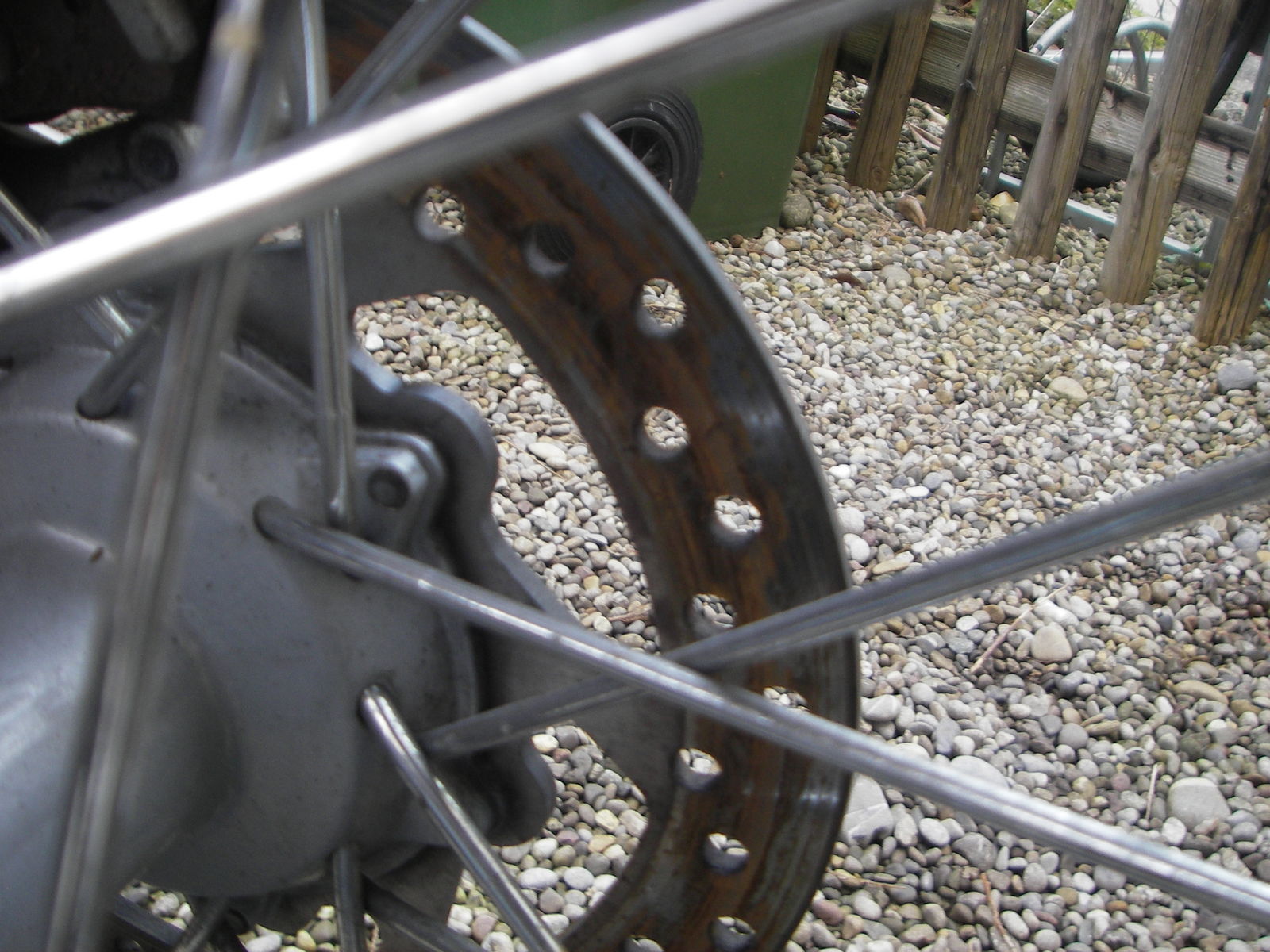 hatte bei mir genau das selbe problem. einschließlich abplatzender chrom an den speichennippeln und rost (richtiger - kein flugrost) an den speichen. zusätzlich noch rost an den krümmern, schalldämpfereinsätzen und diversen schrauben sowie deutliche korrosionsspuren auf nahezu allen blanken metallteilen. das alles nach 6 monaten und 12 tkm. mein händler hat dies bei ktm reklamiert (originalton: rostlaube. damit hat er recht ). leider hat sich ktm wenig kulant gezeigt. es gab nur einen satz neue räder. dafür hat mein händler einen mechaniker dazu verdonnert, den rost zu entfernen. bei der bremsscheibe hat nur schleifpaste geholfen - mit dem nebeneffekt, dass bremsen hinterher nicht mehr drin war. die bremsscheibe müsste wieder gründlich gereinigt werden.