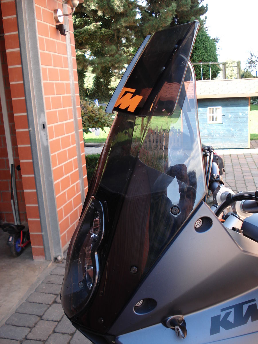 Zurück hab ich mir dann das KTM -Schild für die SM besorgt,um dieses daraufhin gekürzt mit dem MRA-Schiebesystem ,(für 15 Euronen bei MRA zu bestellen,sehr netter Kontakt !),auf die original Scheibe ,welche vorher von mir geschlitzt wurde, zu setzen !