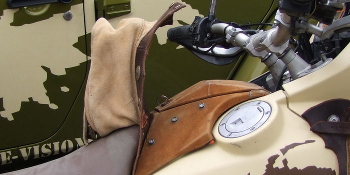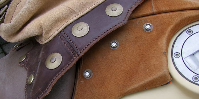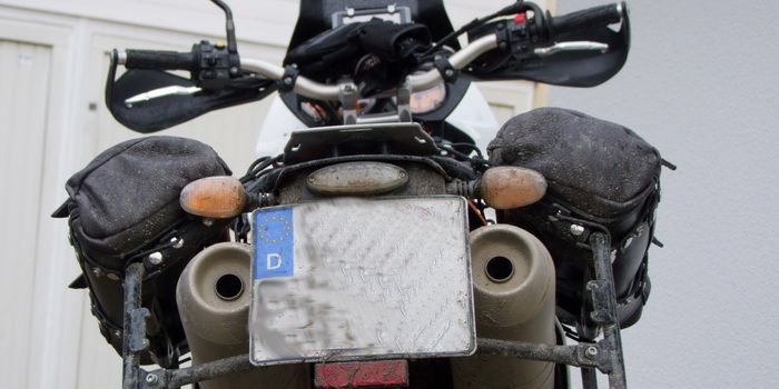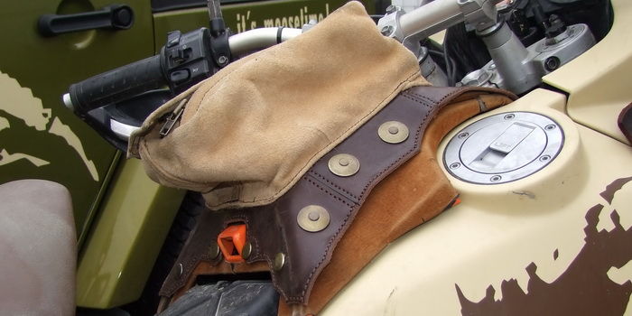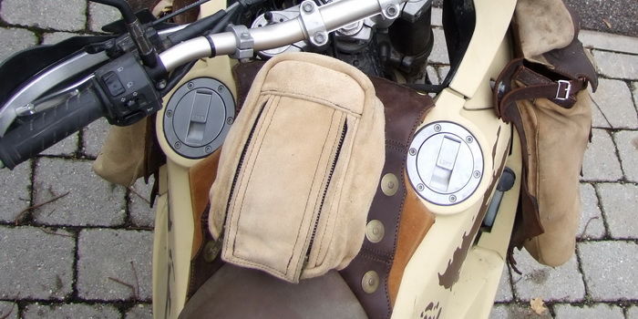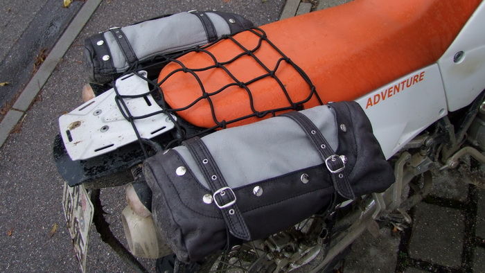 An das Krad werden die Taschen, mittels Riemen die ebenfalls mit Druckknöpfen, und nicht durch fummelige Schnallen geschlossen werden, montiert.