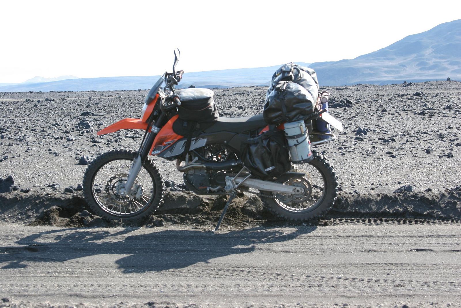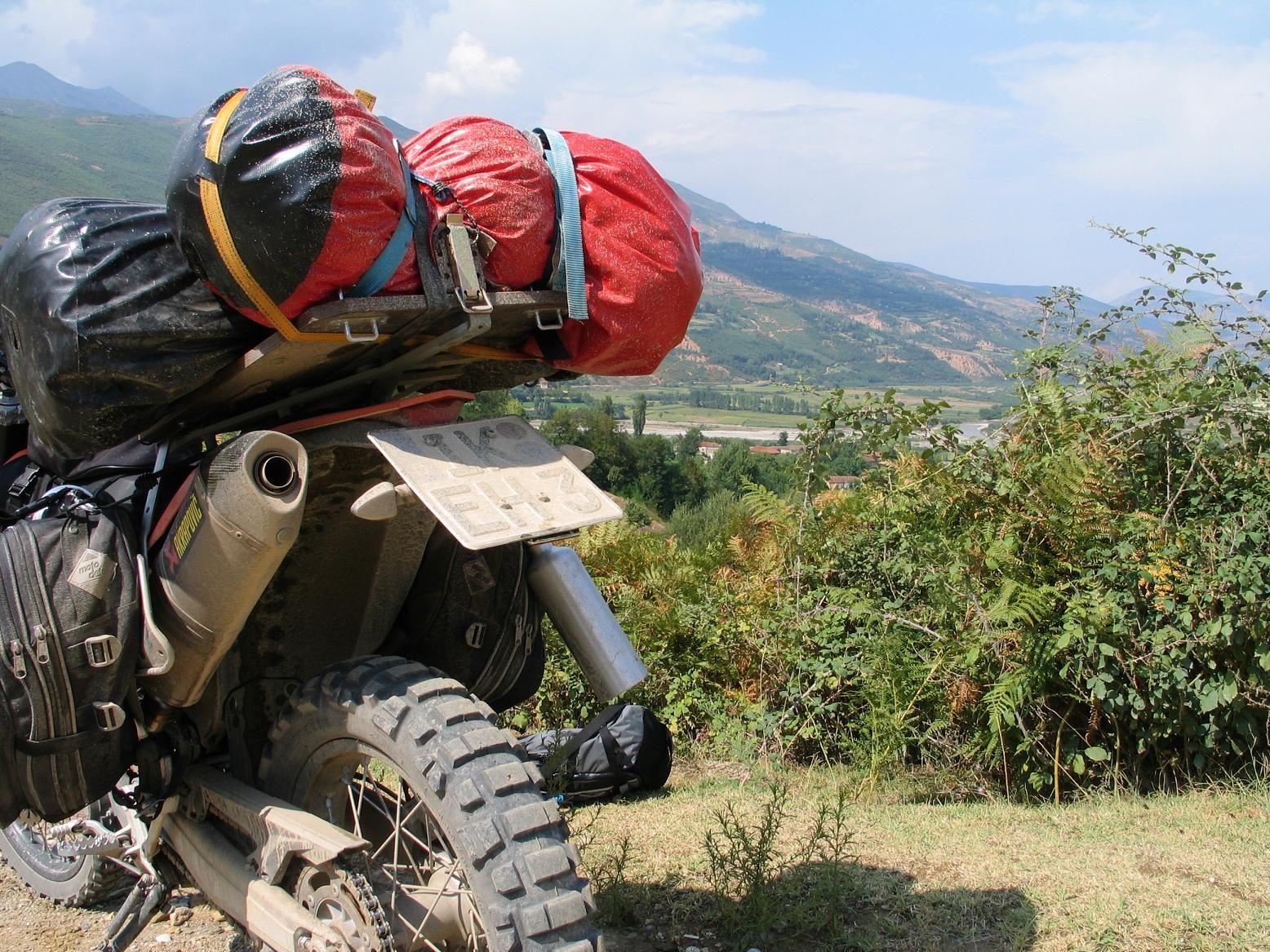 Die Ortlieb Rolle habe ich mit den selbstspannenden Bändern von Touratech befestigt und kann sie so zum tanken in wenigen Sekunden herabnehmen und anschließend wieder montieren