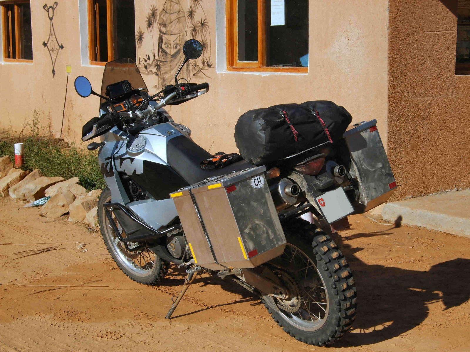 Alternative: Mit zwei Spanngurten kannst Du die Koffer auch direkt am Träger festmachen und die runden, schwarzen Scheiben des Befestigungssatzes von hinten dran halten. Ich hab' dann mit einem mit Farbe getränkten Wattestäbchen durch die Bohrungen hindurch die Bohrstellen markiert ...
